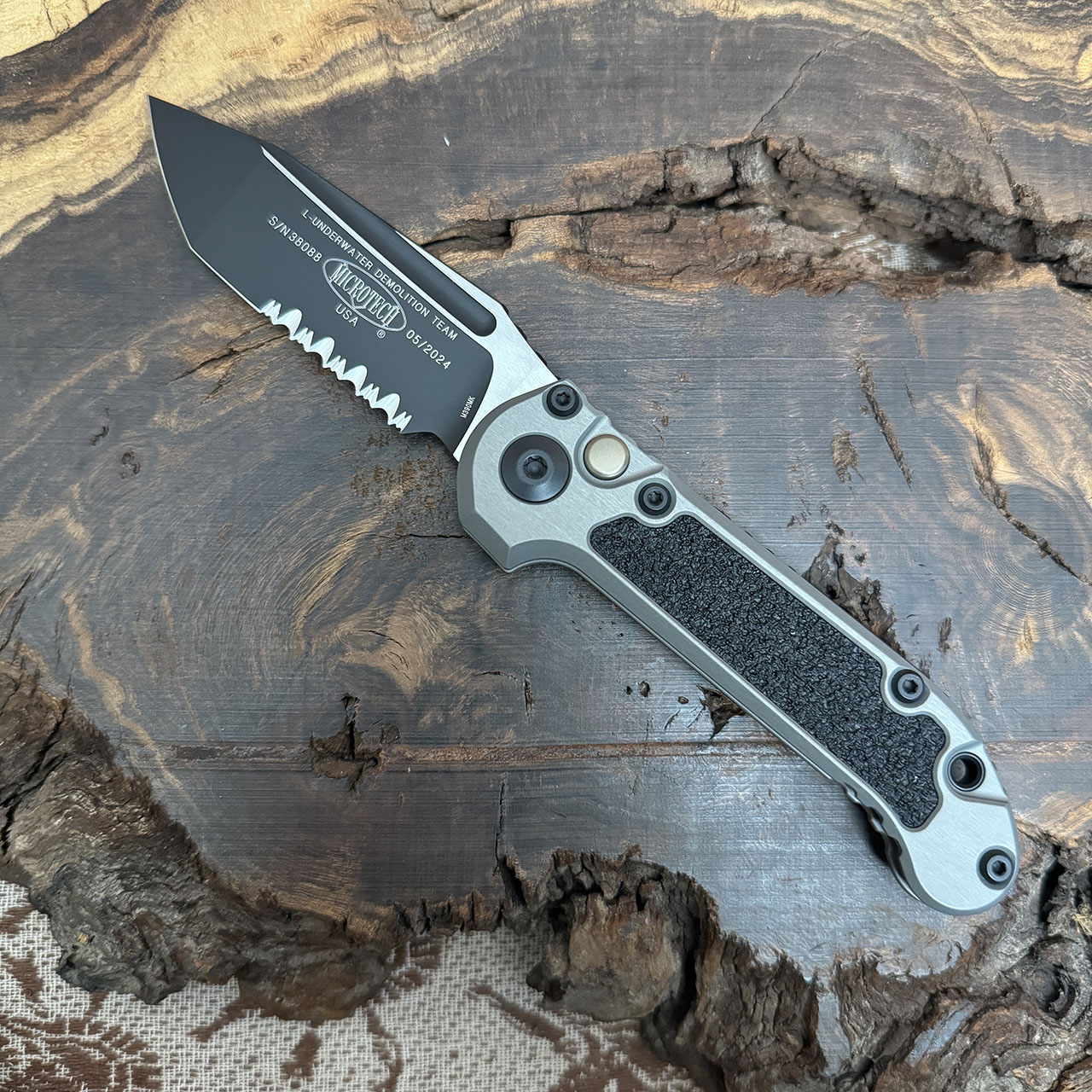 This model features a natural clear aluminum handle with black 3M grip inlays. Blackh finished M390MK stainless steel tanto blade with a partially serrated cutting edge. Torx hardware and tip up pocket clip. The blade is marked with the model information and Microtech logo. The pocket clip is also marked with the Microtech logo. Brand new in box.