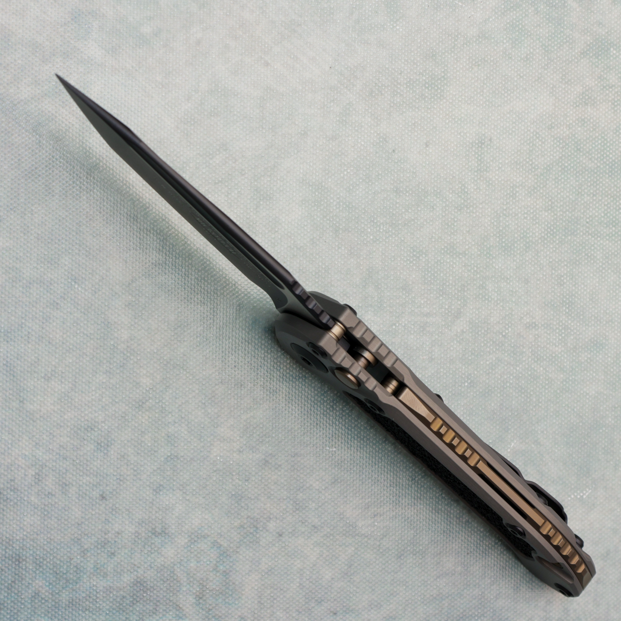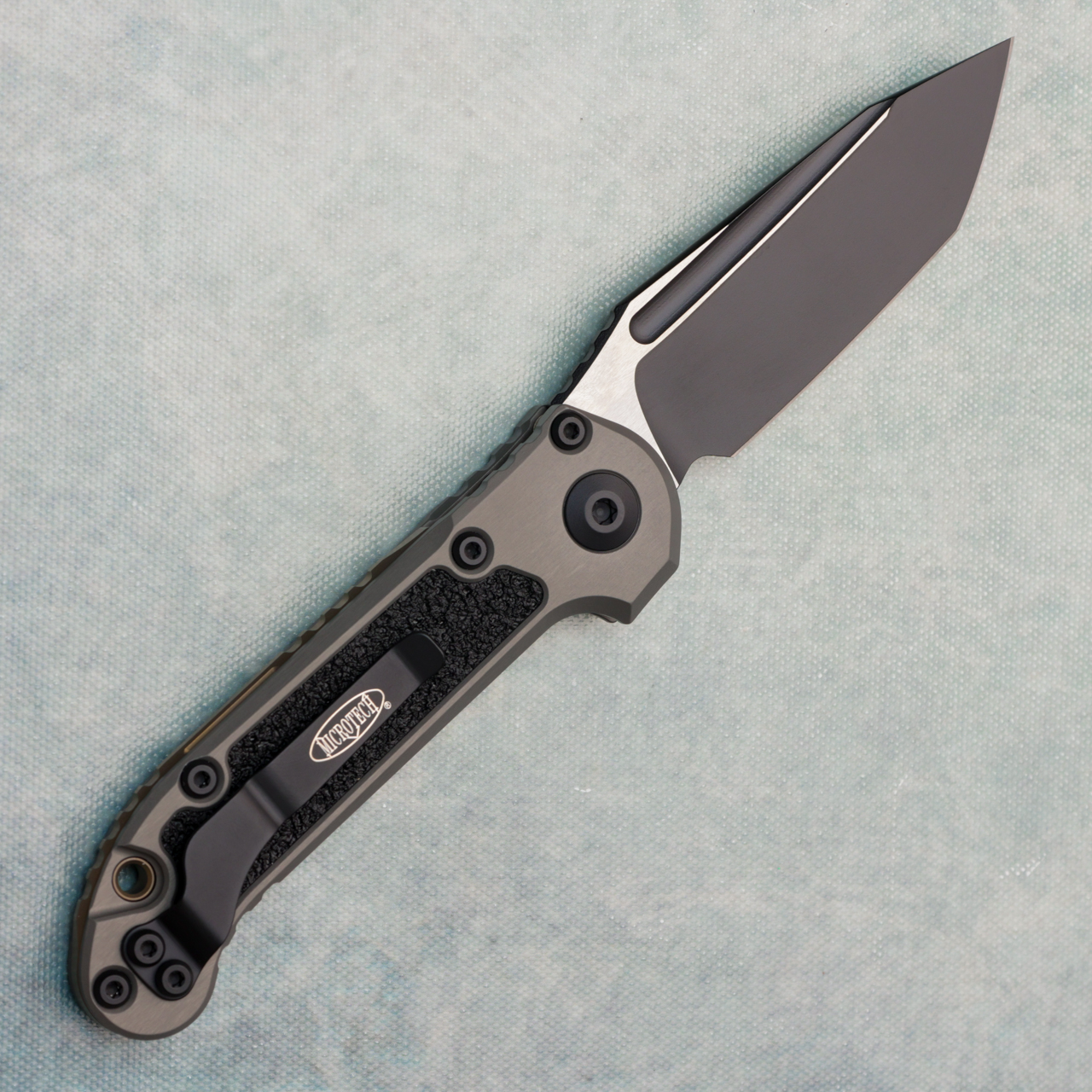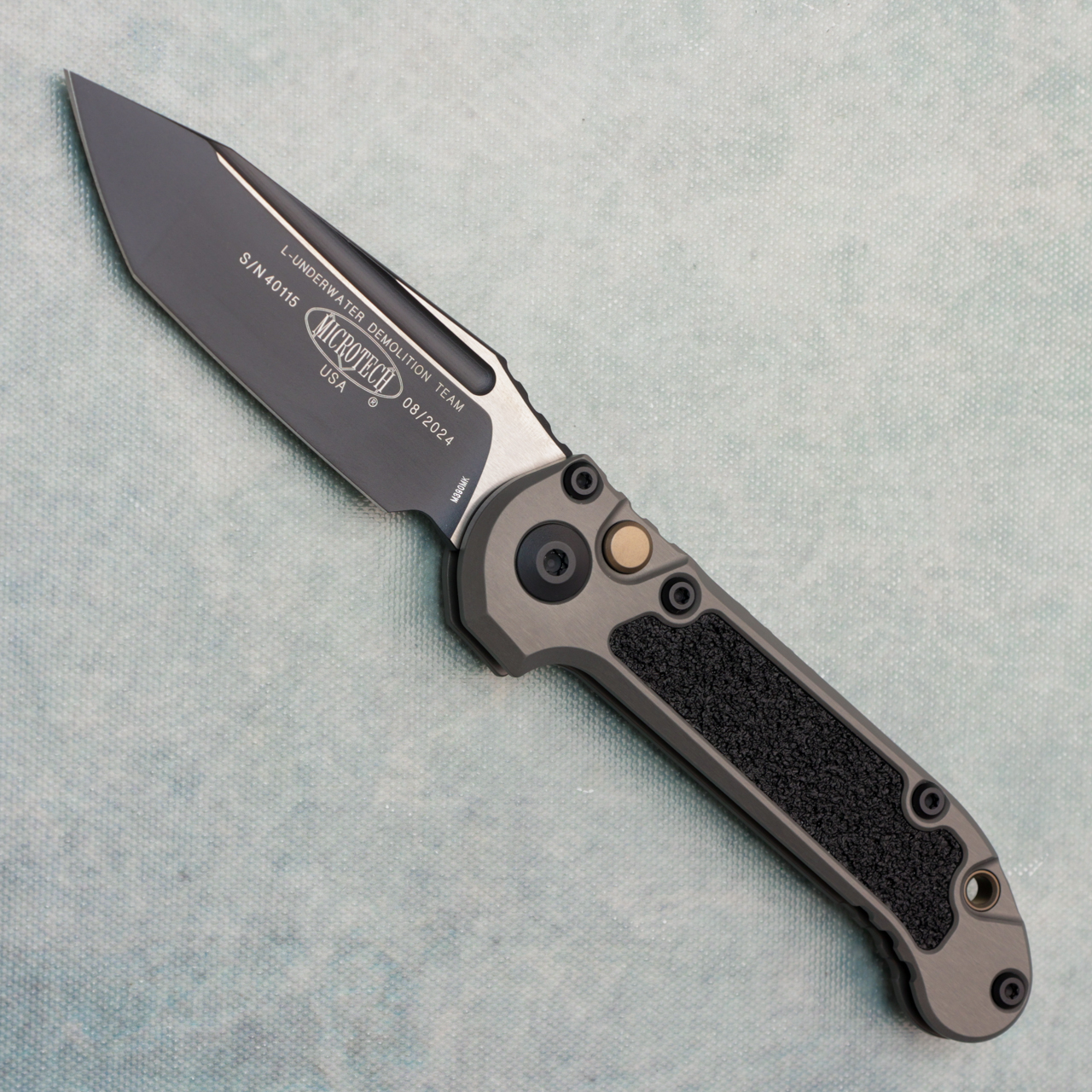 This AE Show Exclusive model features a natural clear anodized 6061-T6 aluminum handle with black 3M grip inlays. Black finished M390MK stainless steel tanto blade with a standard cutting edge. Bronze Titanium backspacer. Torx hardware and tip up pocket clip. The blade is marked with the model information and Microtech logo. The pocket clip is also marked with the Microtech logo. Very good condition, in box.