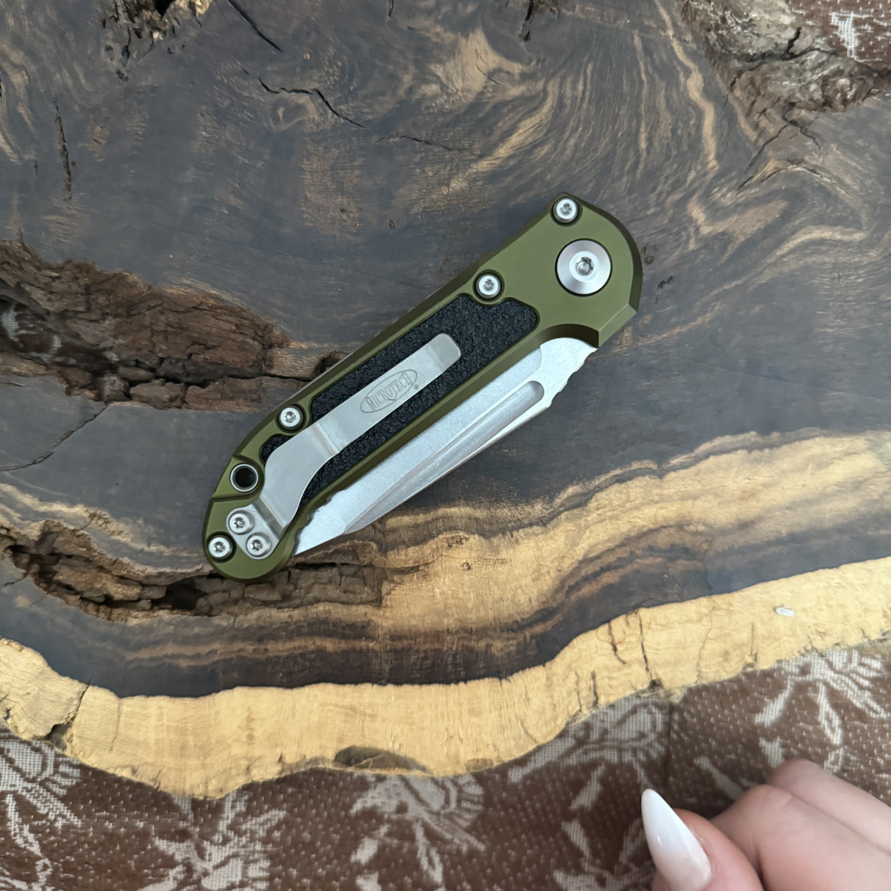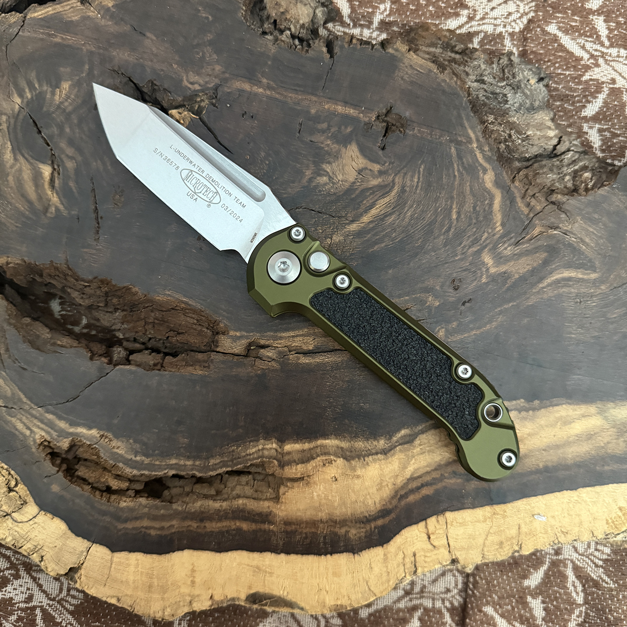 This model features a OD Green anodized 6061-T6 aluminum handle with black 3M grip inlays. Stonewash finished M390MK stainless steel drop point blade with a standard cutting edge. Torx hardware and tip up pocket clip. The blade is marked with the model information and Microtech logo. The pocket clip is also marked with the Microtech logo. Brand new in box.