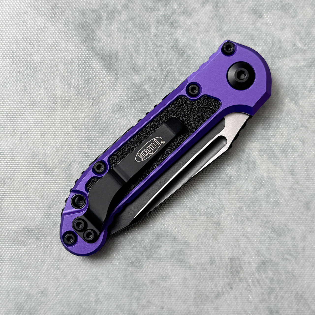 This model features a purple anodized 6061-T6 aluminum handle with black 3M grip inlays. Black finished M390MK stainless steel tanto blade with a standard cutting edge. Torx hardware and tip up pocket clip. The blade is marked with the model information and Microtech logo. The pocket clip is also marked with the Microtech logo. Brand new in box.