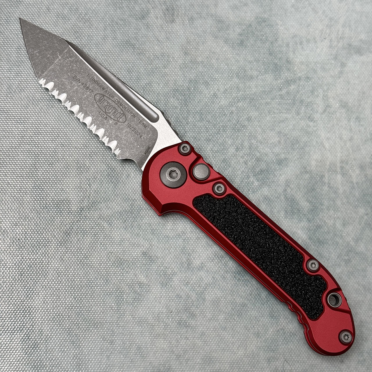 This model features a red anodized 6061-T6 aluminum handle with black 3M grip inlays. Apocalyptic finished M390MK stainless steel tanto full serrated blade. Torx hardware and tip up pocket clip. The blade is marked with the model information and Microtech logo. The pocket clip is also marked with the Microtech logo. Brand new in box.
