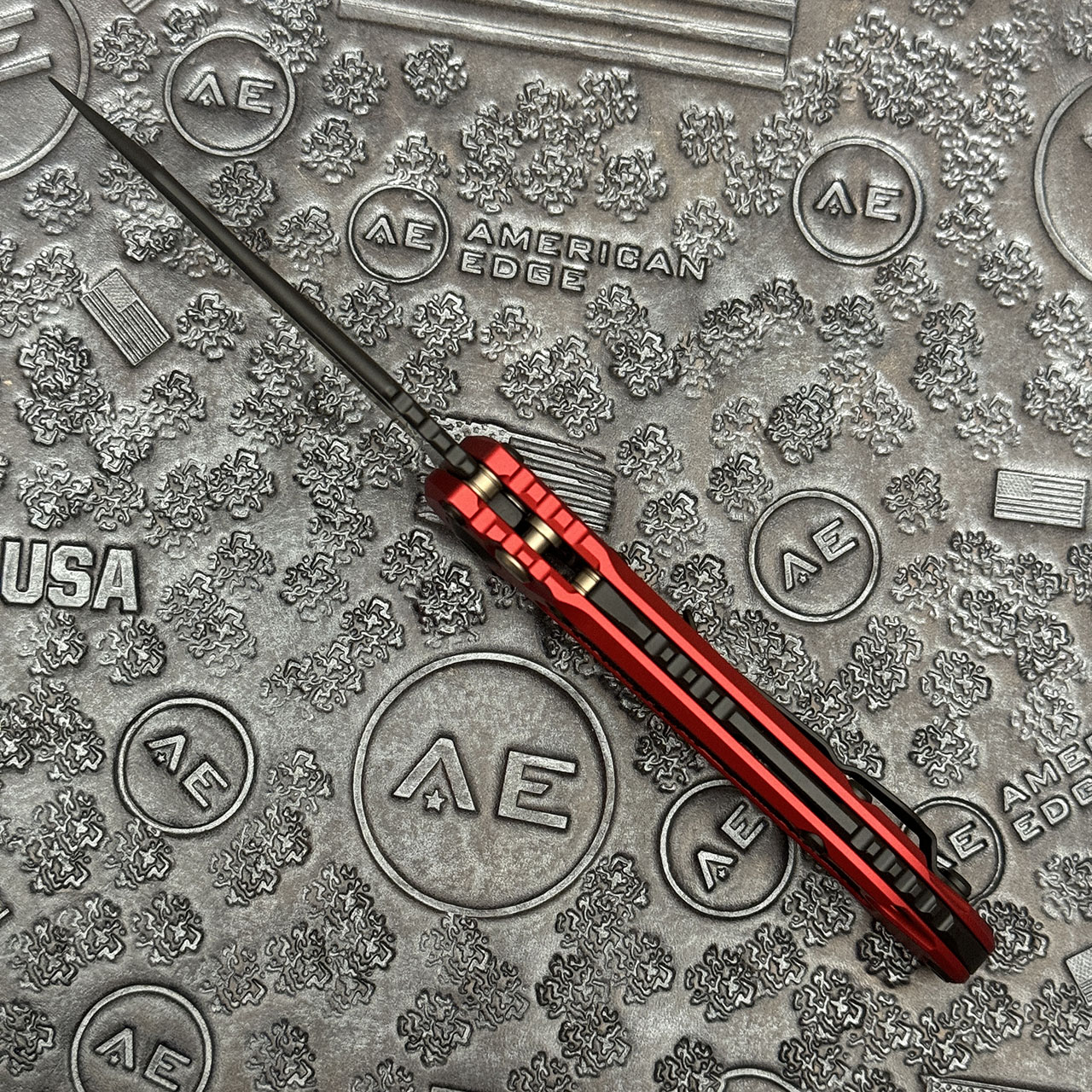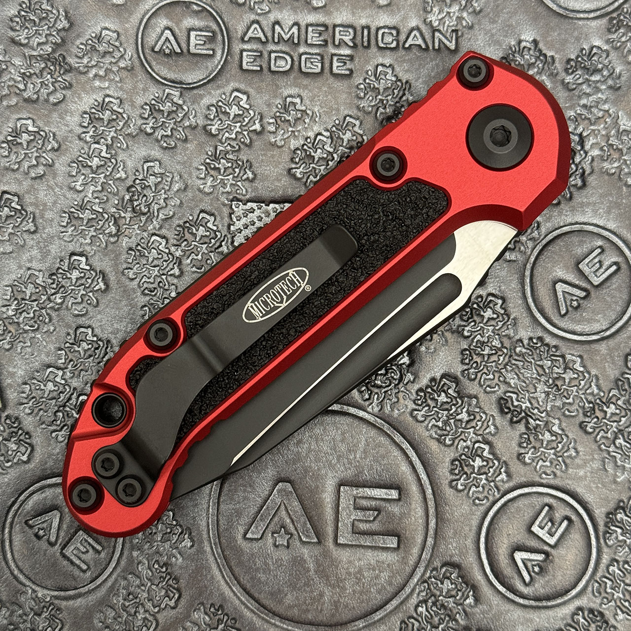 This model features a red aluminum handle with black 3M grip inlays. Black finished M390MK stainless steel tanto blade with a standard cutting edge. Torx hardware and tip up pocket clip. The blade is marked with the model information and Microtech logo. The pocket clip is also marked with the Microtech logo. Brand new in box.