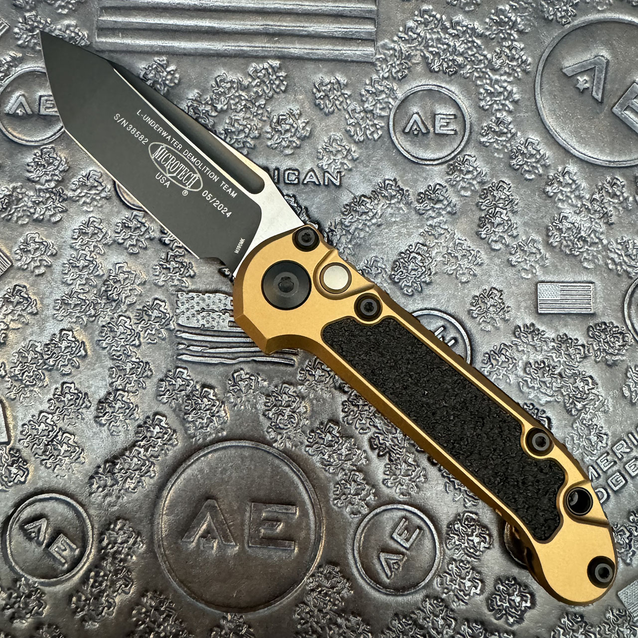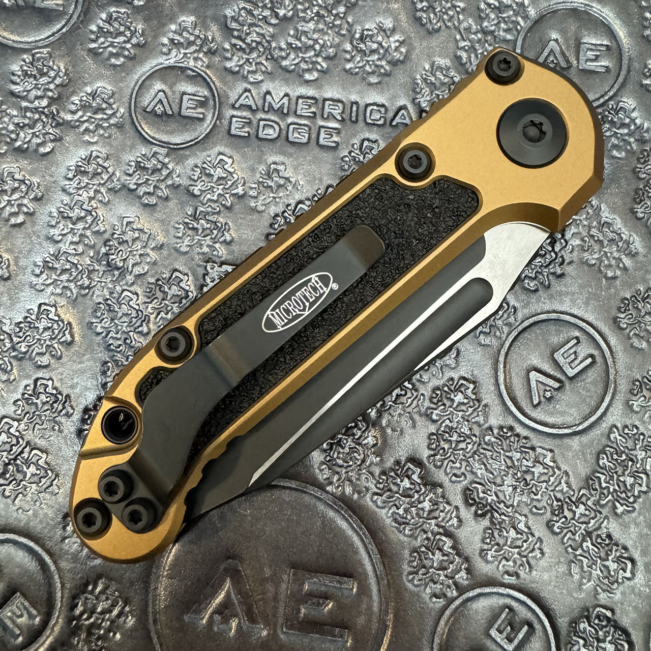 This model features a tan anodized 6061-T6 aluminum handle with black 3M grip inlays. Black finished M390MK stainless steel tanto blade with a standard cutting edge. Torx hardware and tip up pocket clip. The blade is marked with the model information and Microtech logo. The pocket clip is also marked with the Microtech logo. Brand new in box.