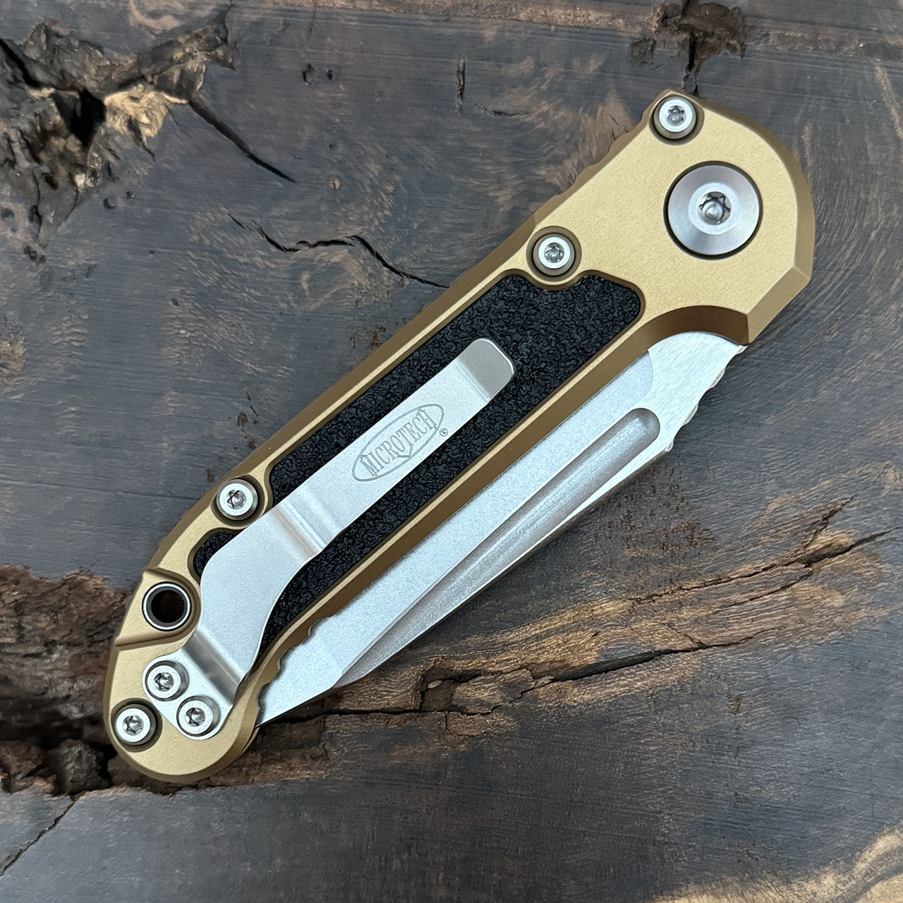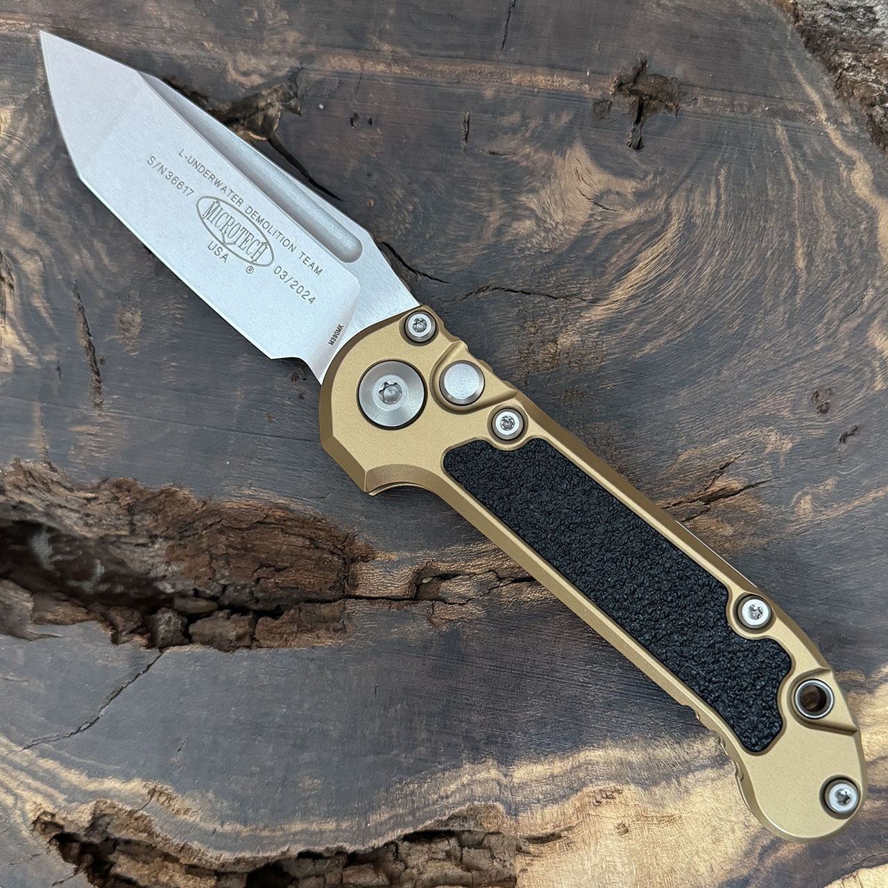 This model features a tan anodized 6061-T6 aluminum handle with black 3M grip inlays. Stonewash finished M390MK stainless steel drop point blade with a standard cutting edge. Torx hardware and tip up pocket clip. The blade is marked with the model information and Microtech logo. The pocket clip is also marked with the Microtech logo. Brand new in box.