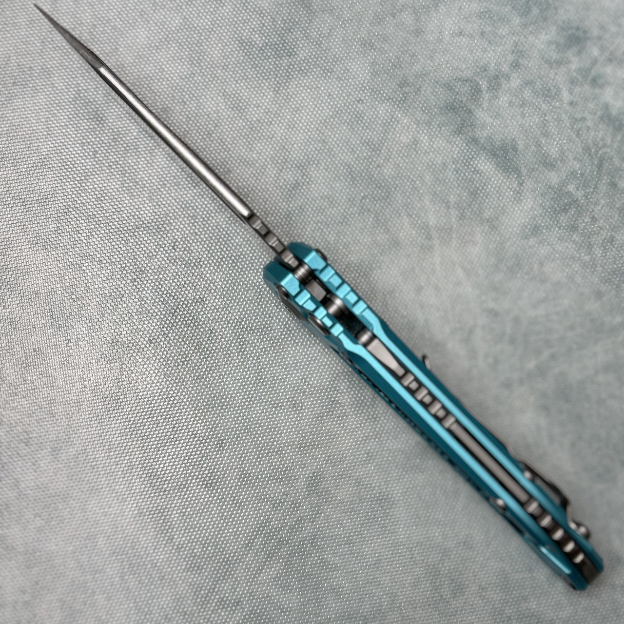 This model features a turquoise anodized 6061-T6 aluminum handle with black 3M grip inlays. Stonewash finished M390MK stainless steel tanto full serrated blade. Torx hardware and tip up pocket clip. The blade is marked with the model information and Microtech logo. The pocket clip is also marked with the Microtech logo. Brand new in box.