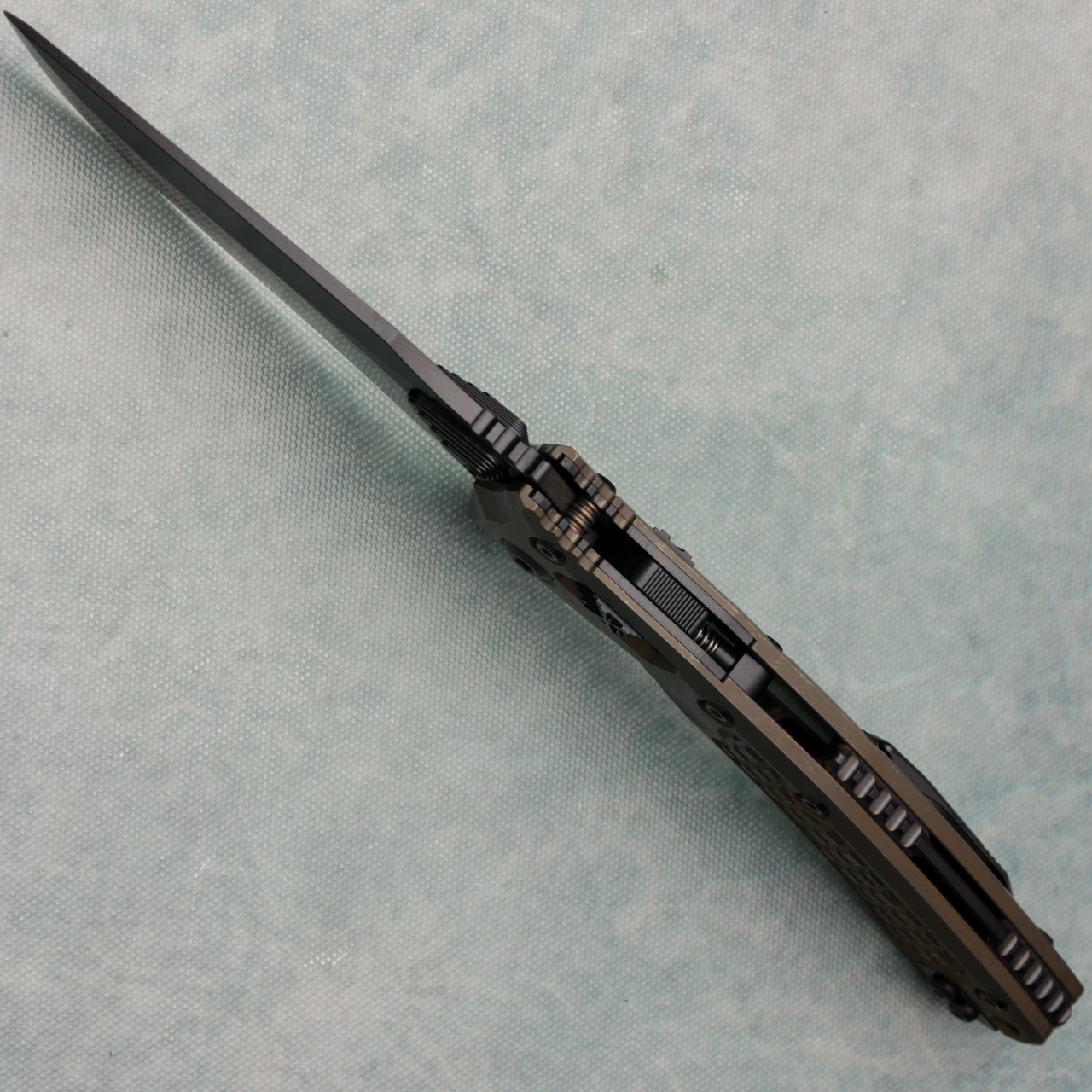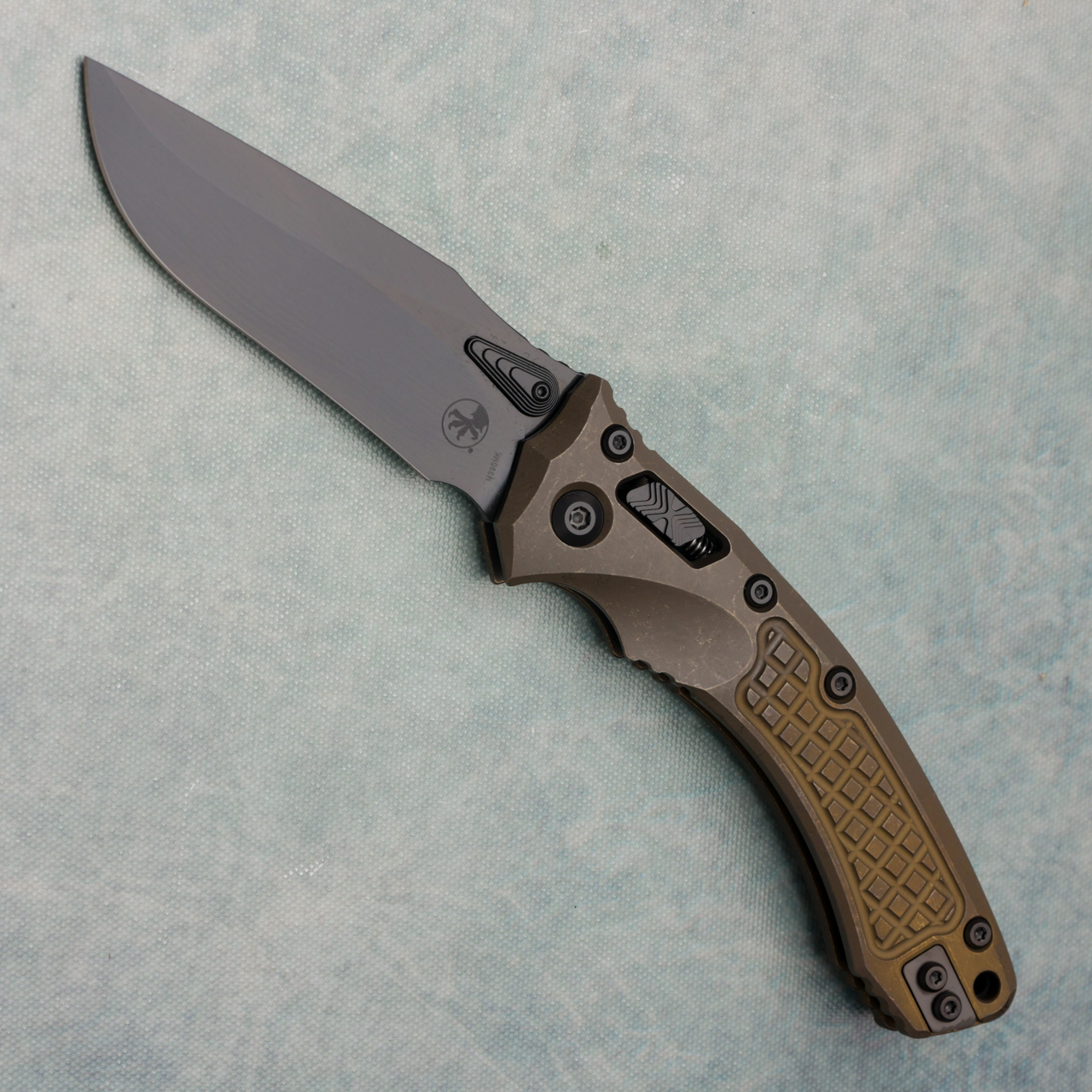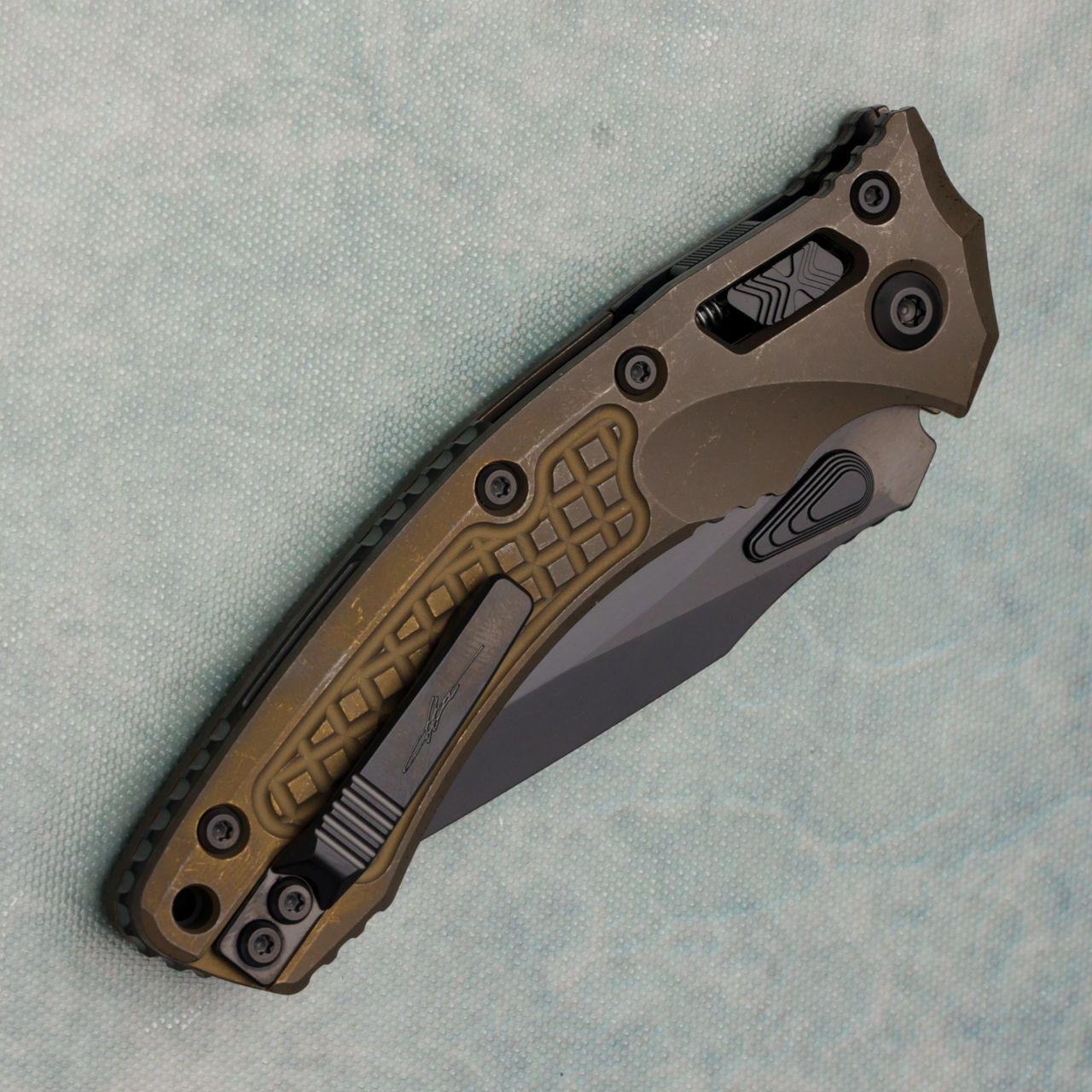 This Signature Series model features antique bronze anodized frag pattern titanium handle scales. DLC finished M390MK stainless steel clip point blade. Complete with DLC titanium backspacer and studs. Brand new in box.