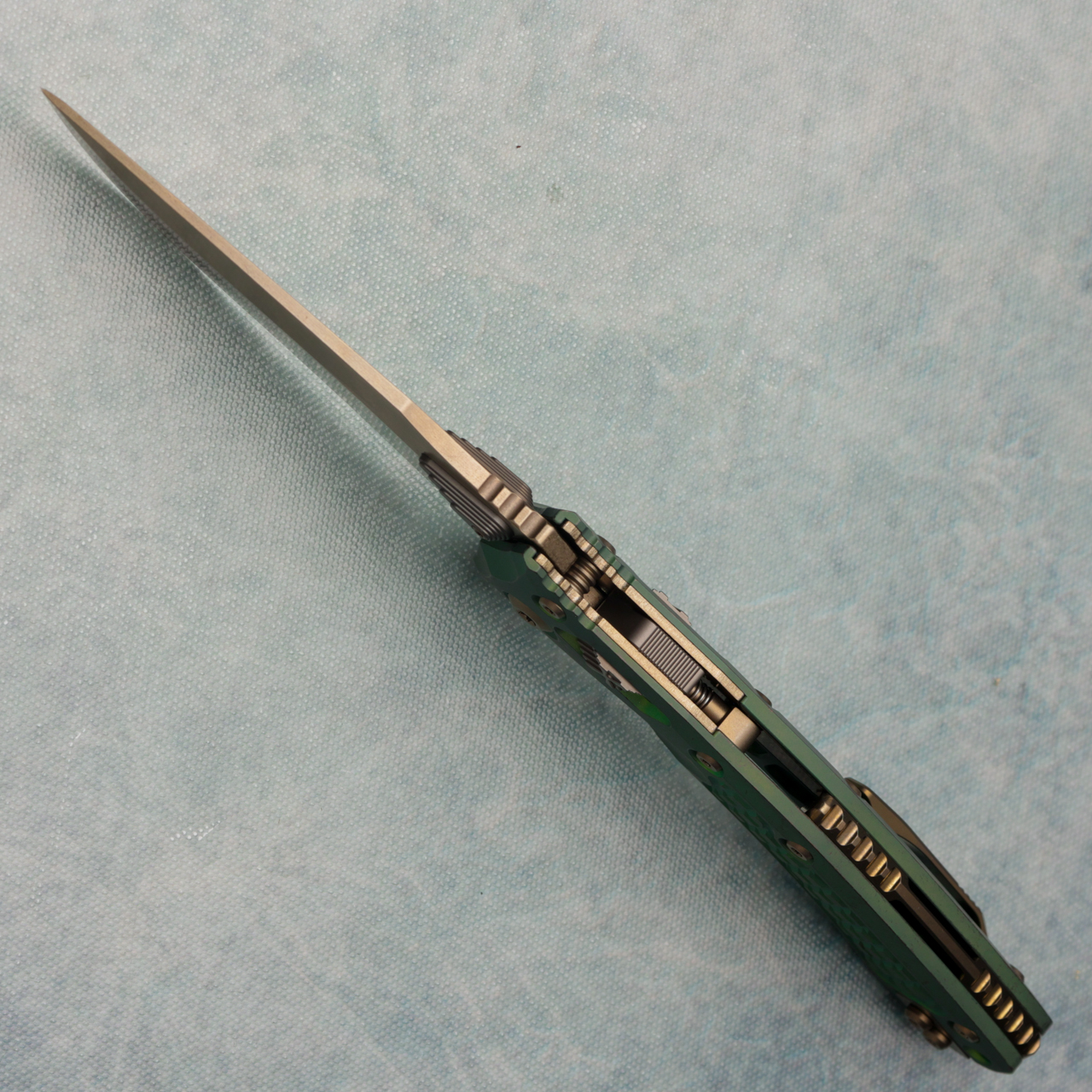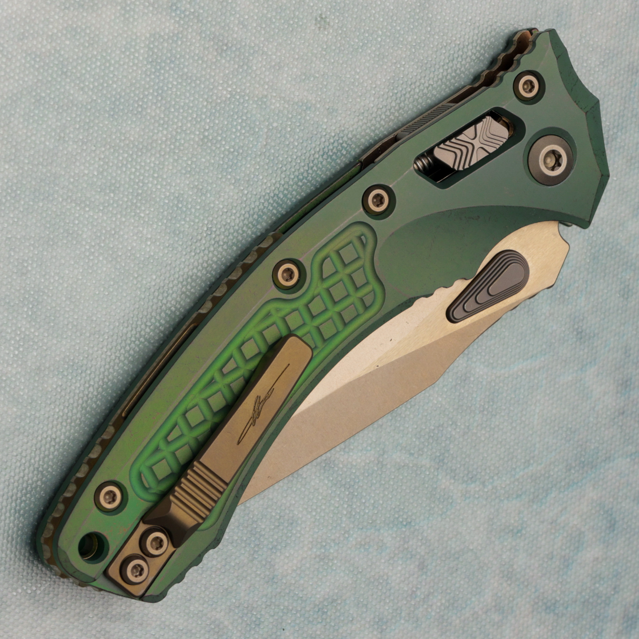 This Signature Series model features antique green anodized frag pattern titanium handle scales. Bronzed finished M390MK stainless steel clip point blade. Complete with bronze titanium backspacer and studs. Brand new in box.