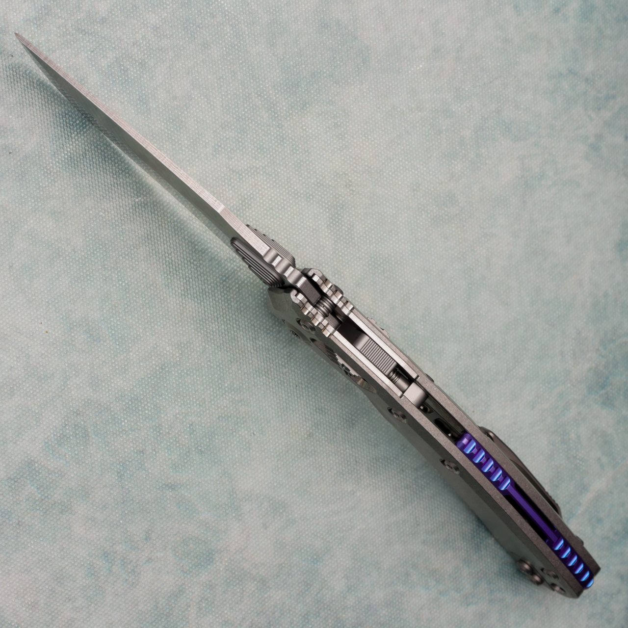This Signature Series model features stonewash titanium handle scales. Stonewash finished M390MK stainless steel clip point blade. Complete with a purple titanium backspacer. Brand new in box.