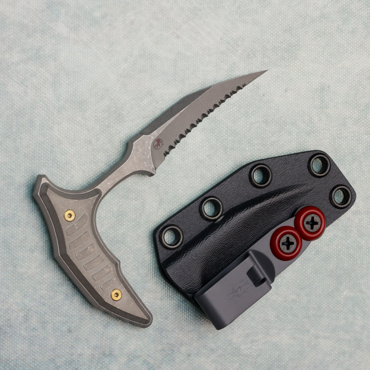 Microtech Marfione Select Bastinelli Bee Fixed Blade Apocalyptic Titanium Handle Apocalyptic Full Serrated Blade Blue Hardware 218-12APMS1