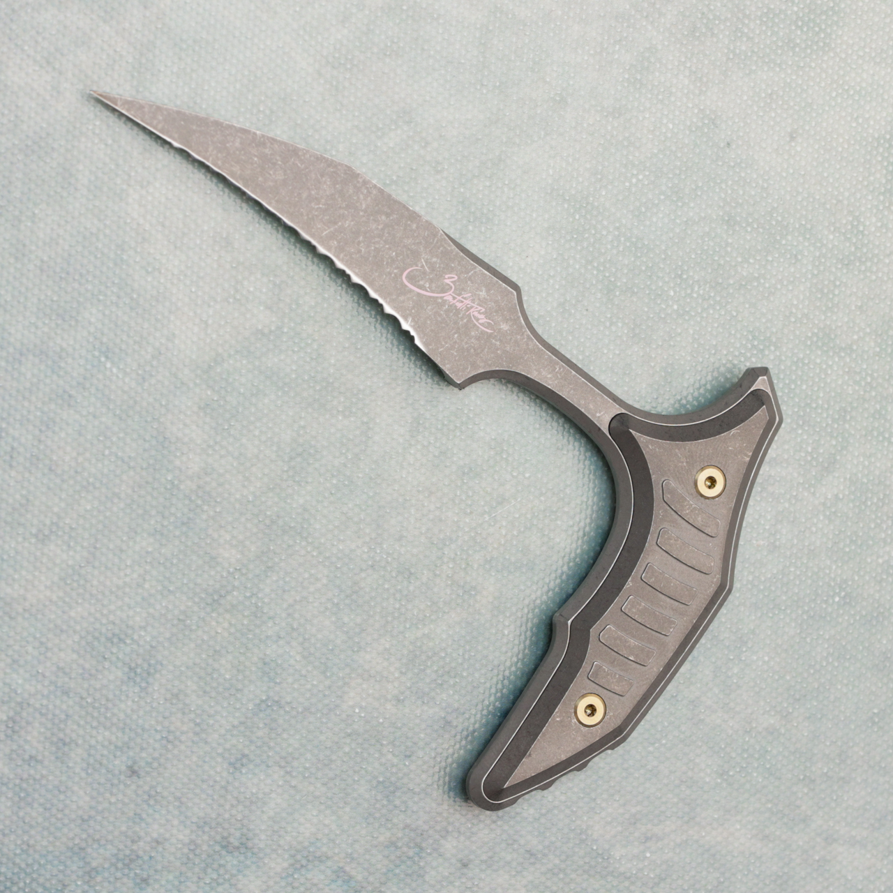 This Marfione Select Bee features titanium handles and an apocalyptic 440C stainless steel wharncliffe blade with a full serrated cutting edge. The blade itself features the Signature Series logo. The back of the Blade features the Bastinelli logo. Bronze titanium hardware. Brand new in box.