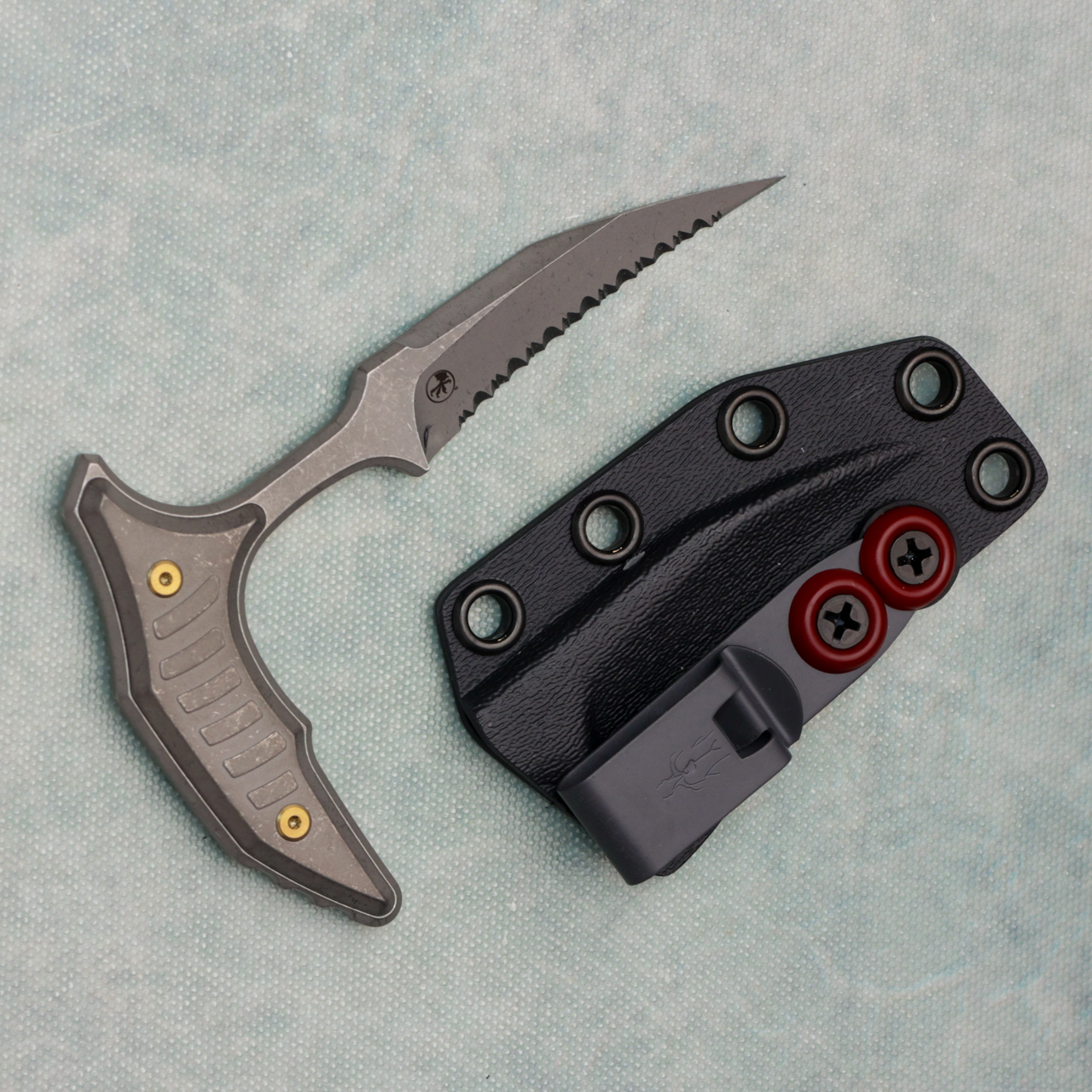 Microtech Marfione Select Bastinelli Bee Fixed Blade Apocalyptic Titanium Handle Apocalyptic Full Serrated Blade Bronze Hardware 218-12APMS2