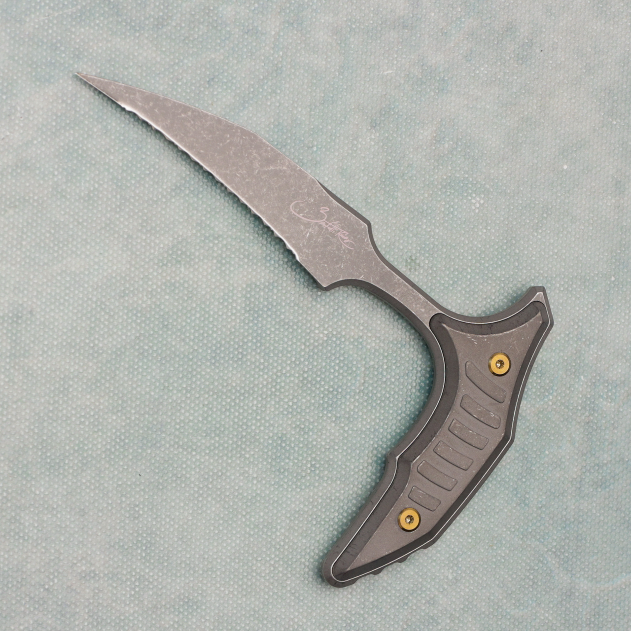 This Marfione Select Bee features apocalyptic titanium handles and an apocalyptic M390 stainless steel wharncliffe blade with a full serrated cutting edge. The blade itself features the Signature Series logo. The back of the Blade features the Bastinelli logo. Bronze titanium hardware. Brand new in box.
