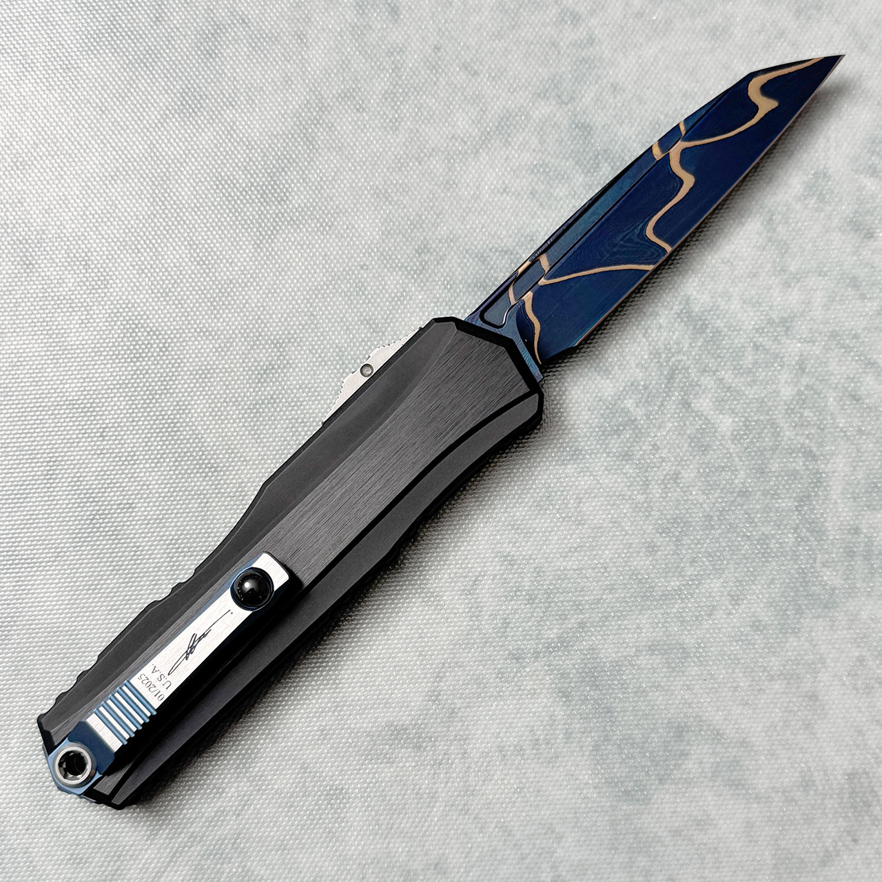 Microtech Marfione Select Cypher II Wharncliffe Hefted Alloy Hard Cut w/ Blue Titanium Accents Blued Baker Forge Coppermai Damascus Tritium Button Insert 1241-16MS1