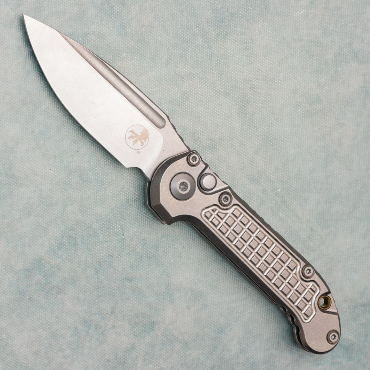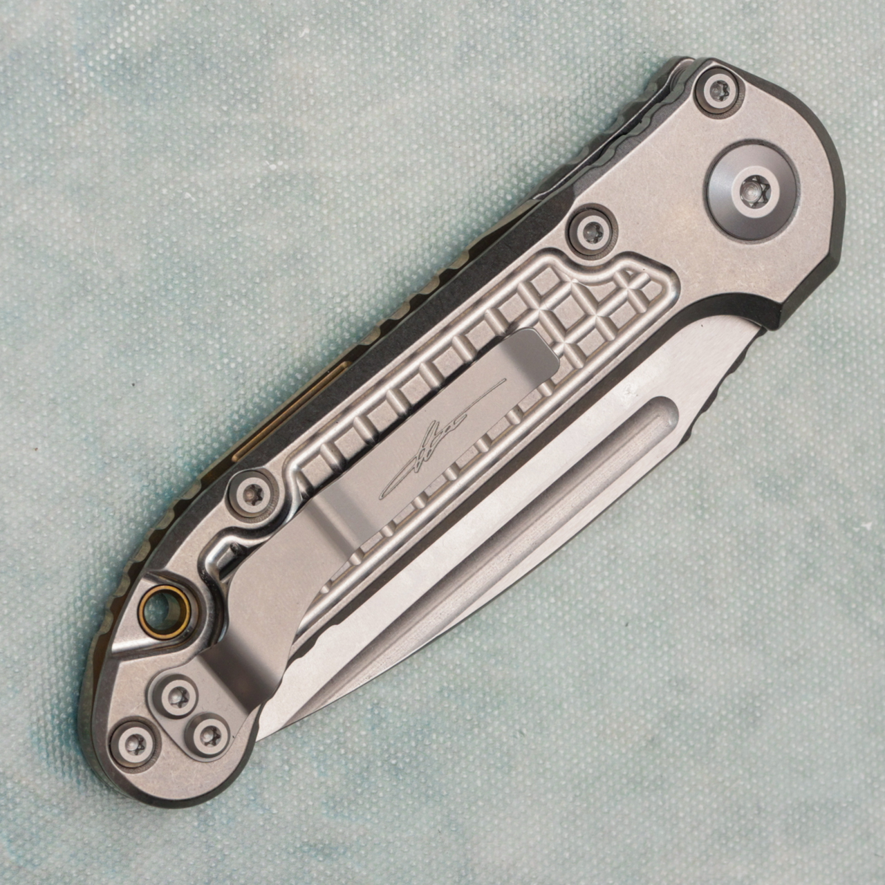 This model features an stonewash frag titanium handle. Stonewash finished M390MK stainless steel clip point blade with a standard cutting edge. Bronze titanium backspacer. Torx hardware and tip up pocket clip. Brand new in box.