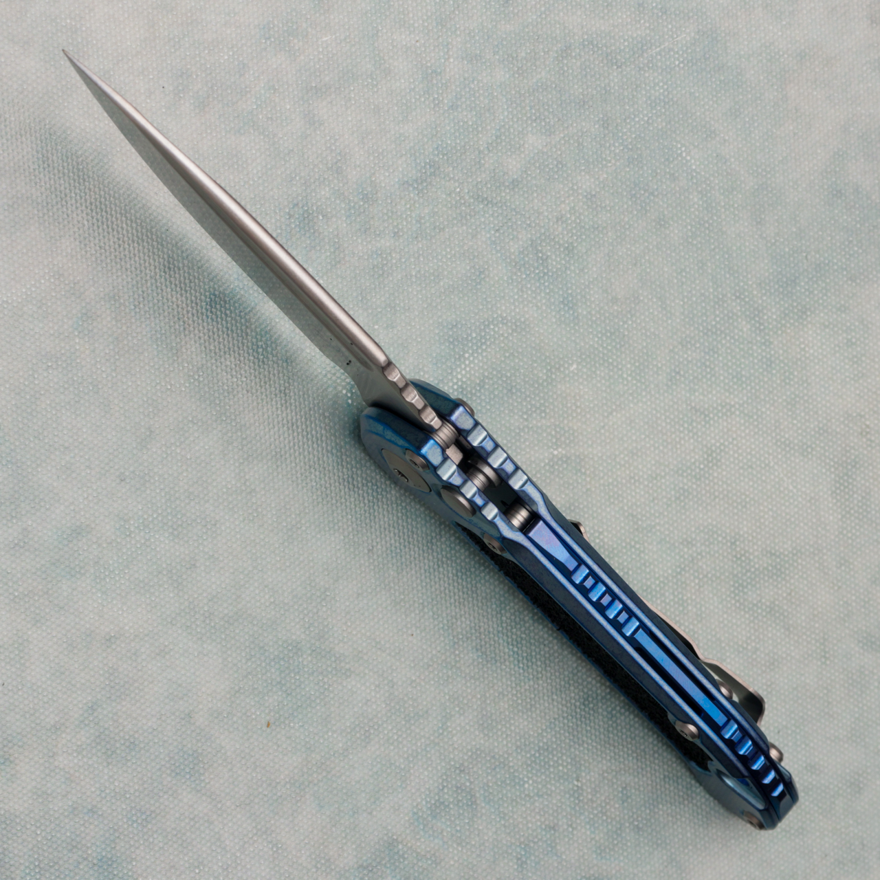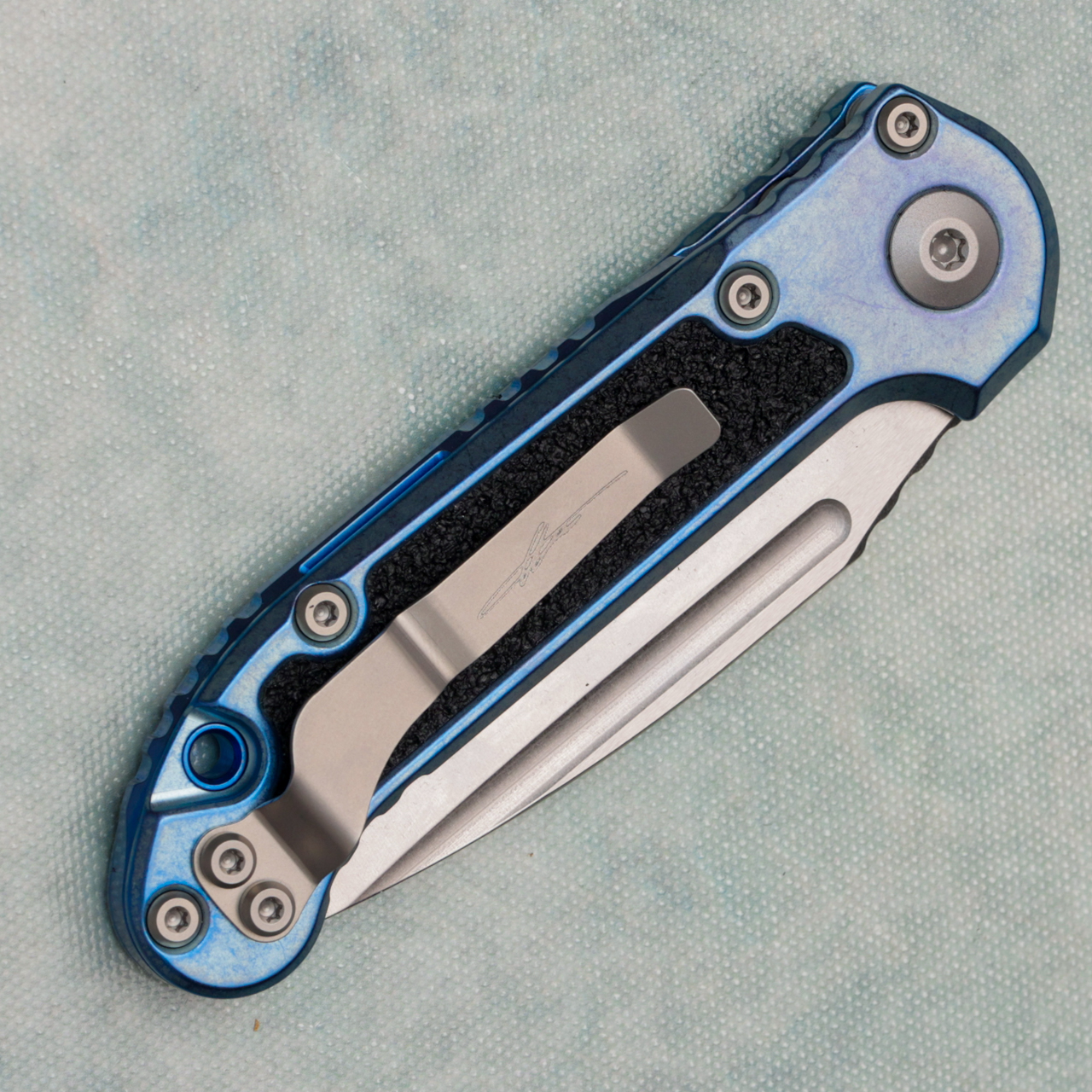 This model features a ice blue anodized titanium handle with black grip tape inlays. Stonewash finished M390MK stainless steel clip point blade with a standard cutting edge. Blue titanium backspacer. Torx hardware and tip up pocket clip. Brand new in box.
