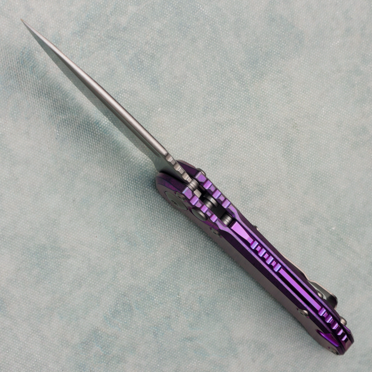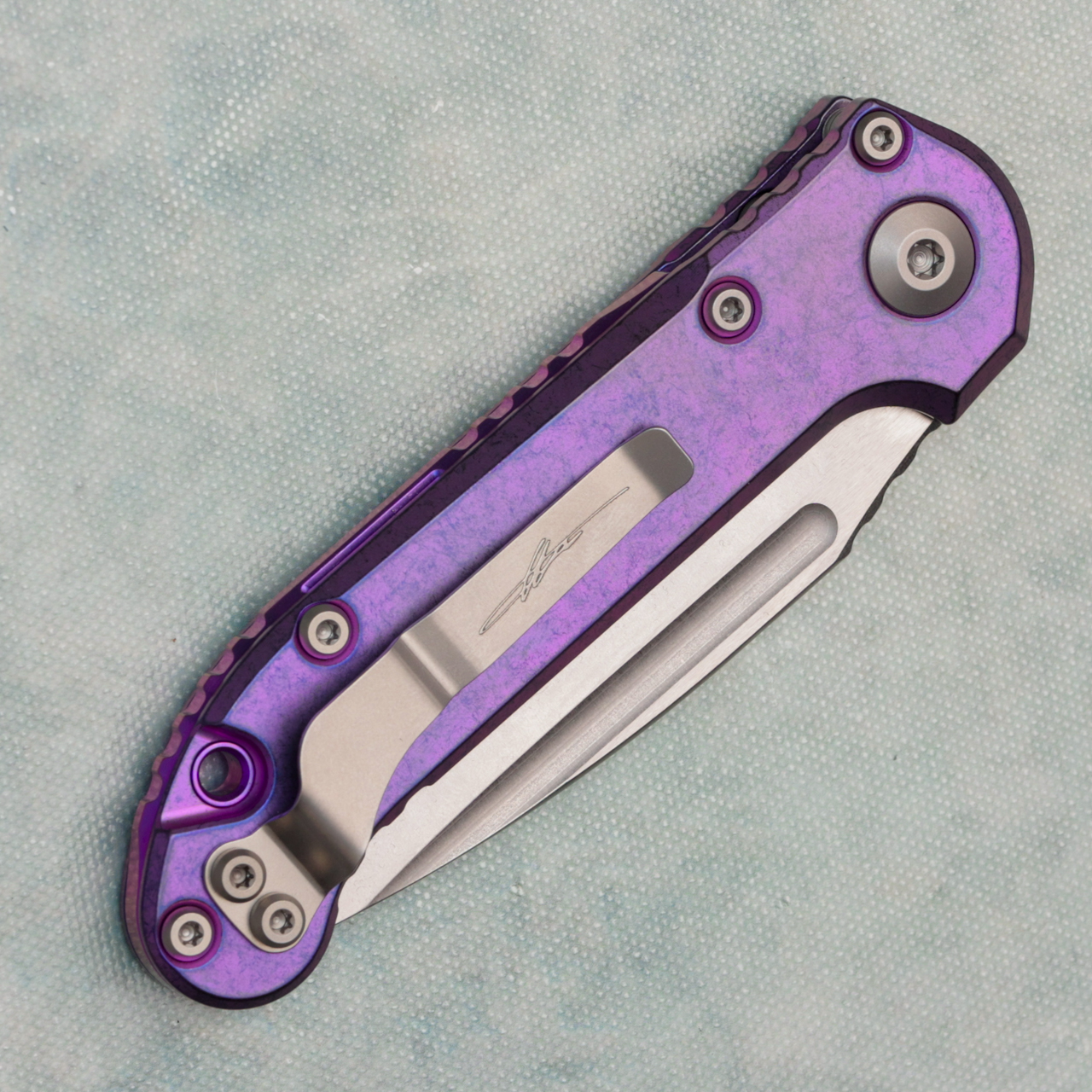 This model features an stonewash Purple haze anodized titanium handle. Stonewash finished M390MK stainless steel clip point blade with a standard cutting edge. Purple titanium backspacer. Torx hardware and tip up pocket clip. Brand new in box.