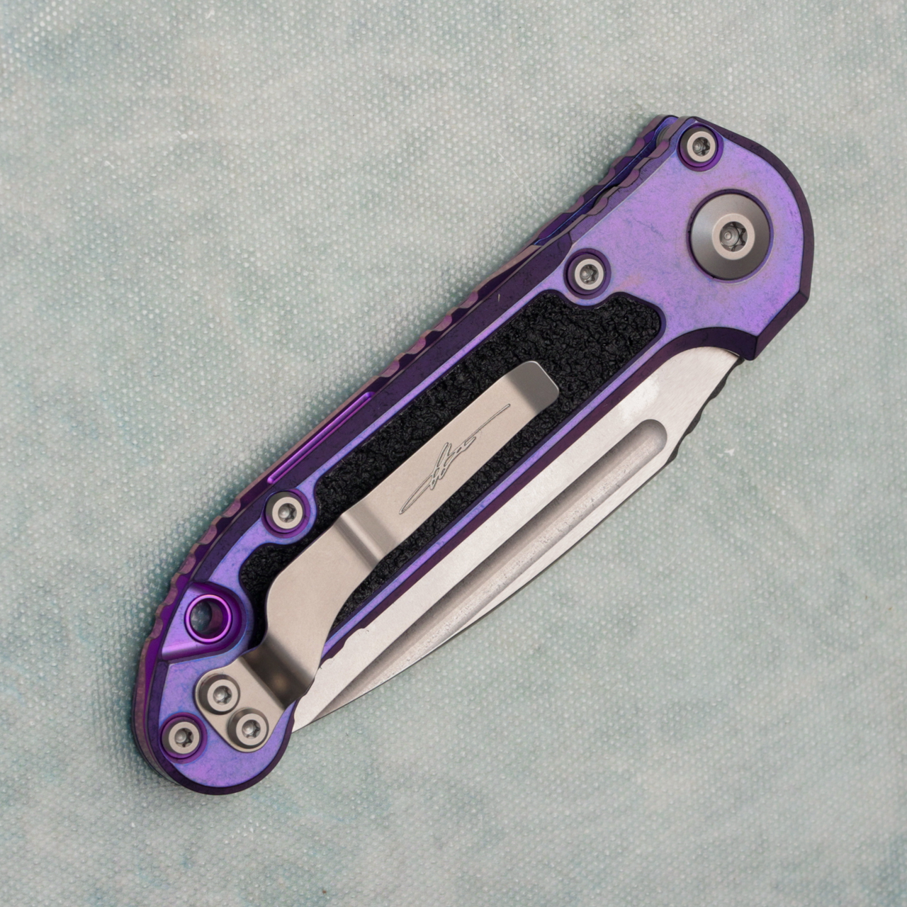 This model features a purple haze anodized titanium handle with black grip tape inlays. Stonewash finished M390MK stainless steel clip point blade with a standard cutting edge. Purple titanium backspacer. Torx hardware and tip up pocket clip. Brand new in box.