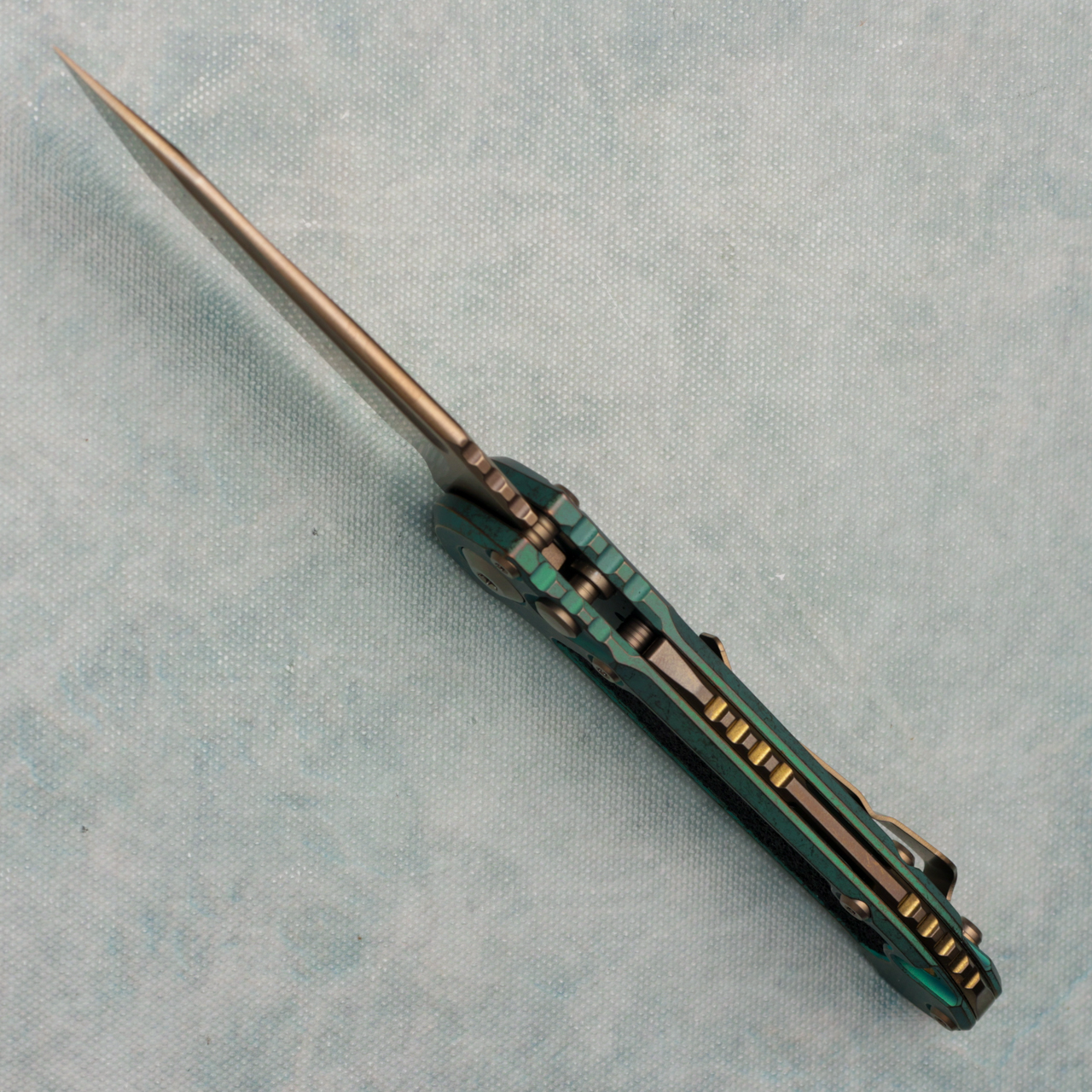 This model features a antique green anodized stonewash titanium handle with black grip tape inlays. Bronzed stonewash finished M390MK stainless steel tanto blade with a standard cutting edge. Bronze titanium backspacer. Torx hardware and tip up pocket clip. Brand new in box.