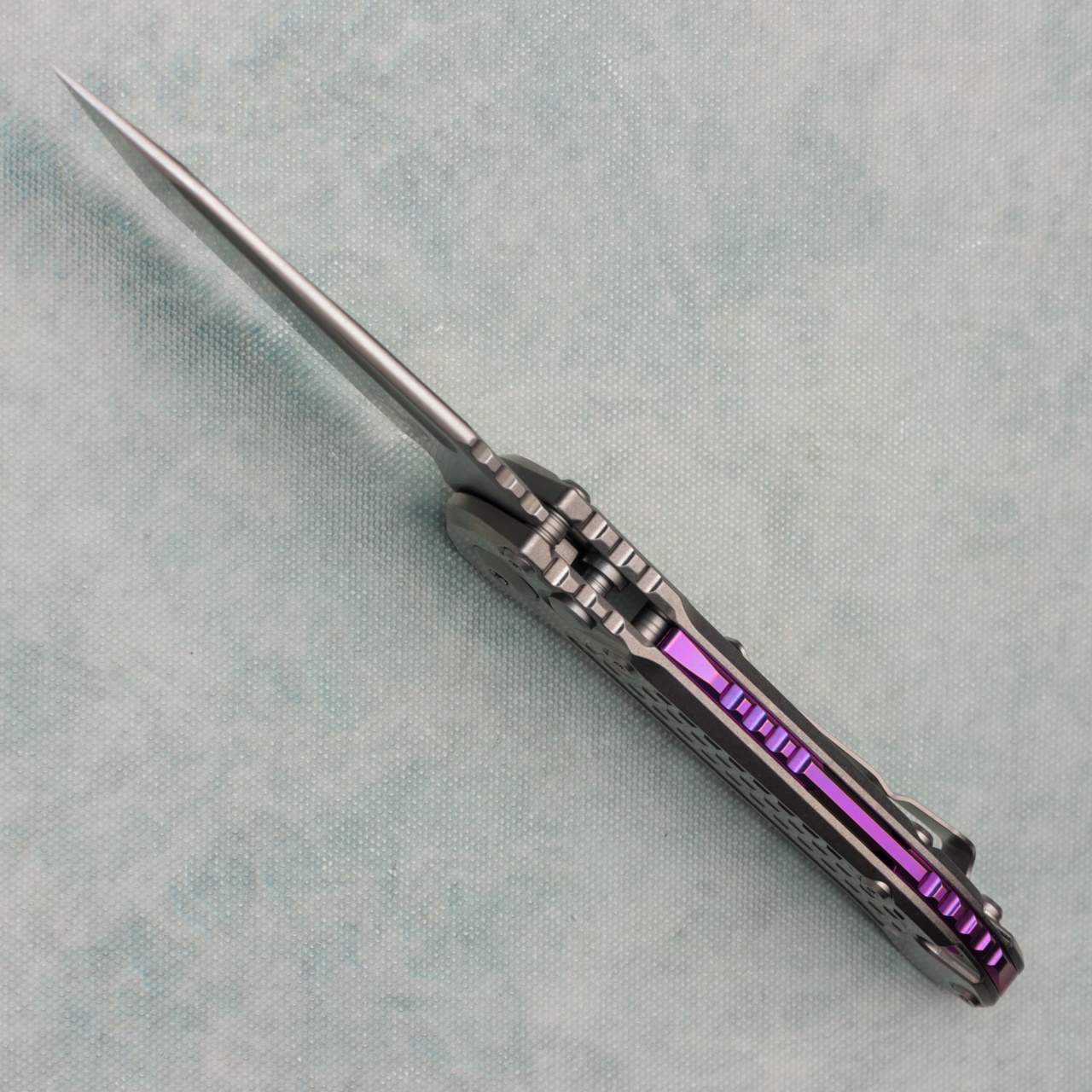 This model features an stonewash frag titanium handle. Stonewash finished M390MK stainless steel tanto blade with a standard cutting edge. Purple titanium backspacer. Torx hardware and tip up pocket clip. Brand new in box.