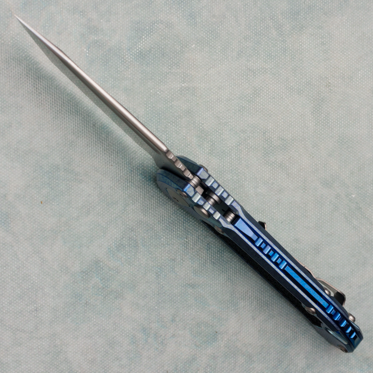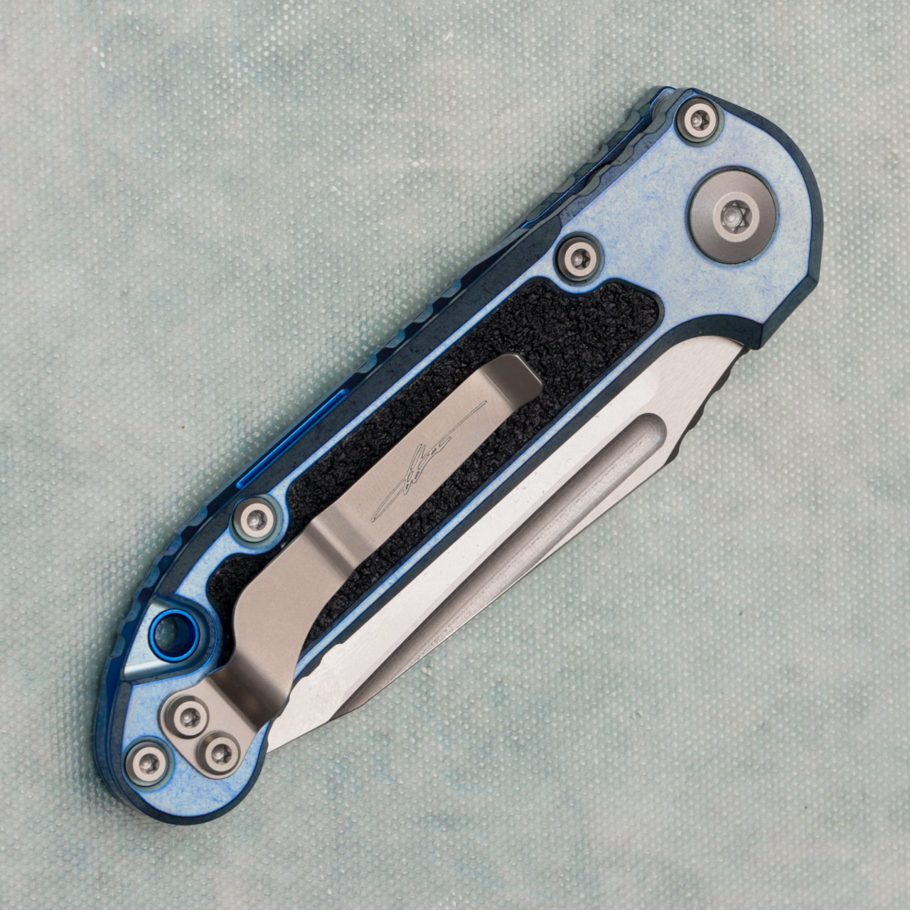 This model features a ice blue anodized stonewash titanium handle with black grip tape inlays. Stonewash finished M390MK stainless steel tanto blade with a standard cutting edge. Blue titanium backspacer. Torx hardware and tip up pocket clip. Brand new in box.