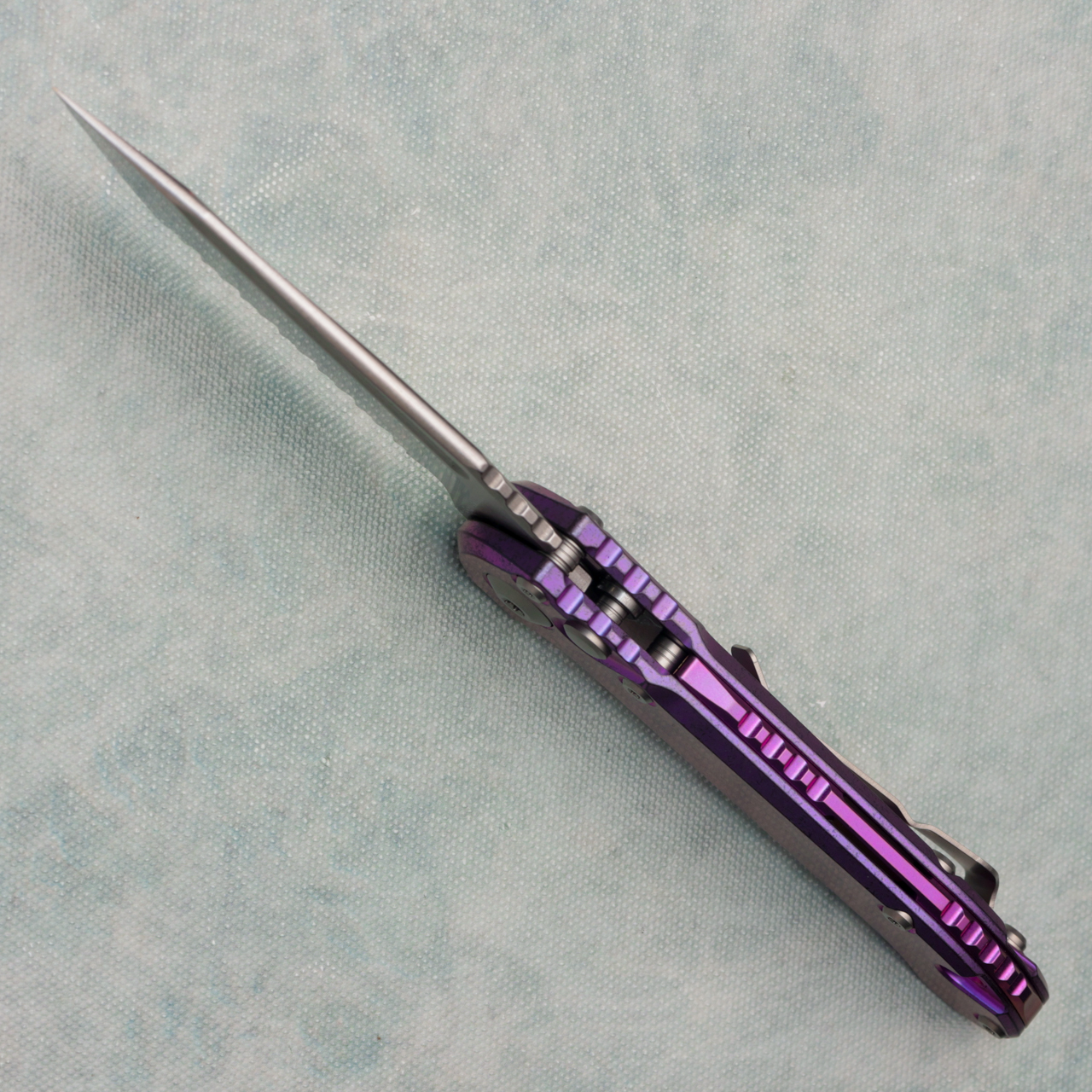 This model features an stonewash purple haze anodized titanium handle. Stonewash finished M390MK stainless steel tanto blade with a full serrated cutting edge. Purple titanium backspacer. Torx hardware and tip up pocket clip. Brand new in box.