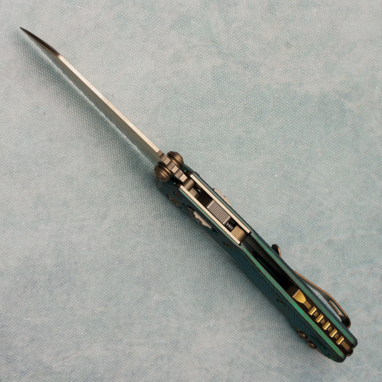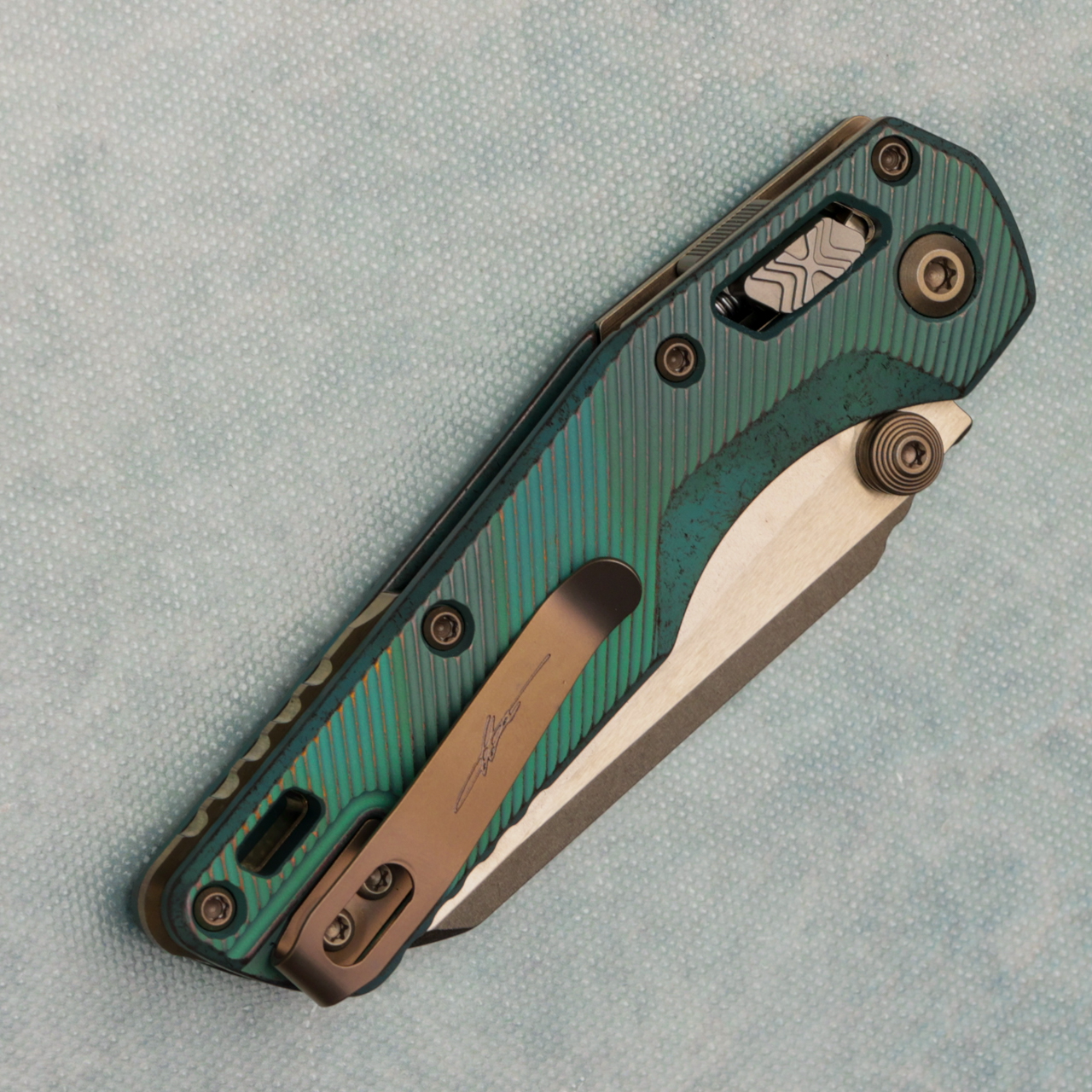This model has antique green anodized fluted titanium handles. Bronzed stonewash finished M390MK single edge full serrated blade. Complete with a bronze titanium backspacer and reversible pocket clip for left-hand carry. Brand new in box.