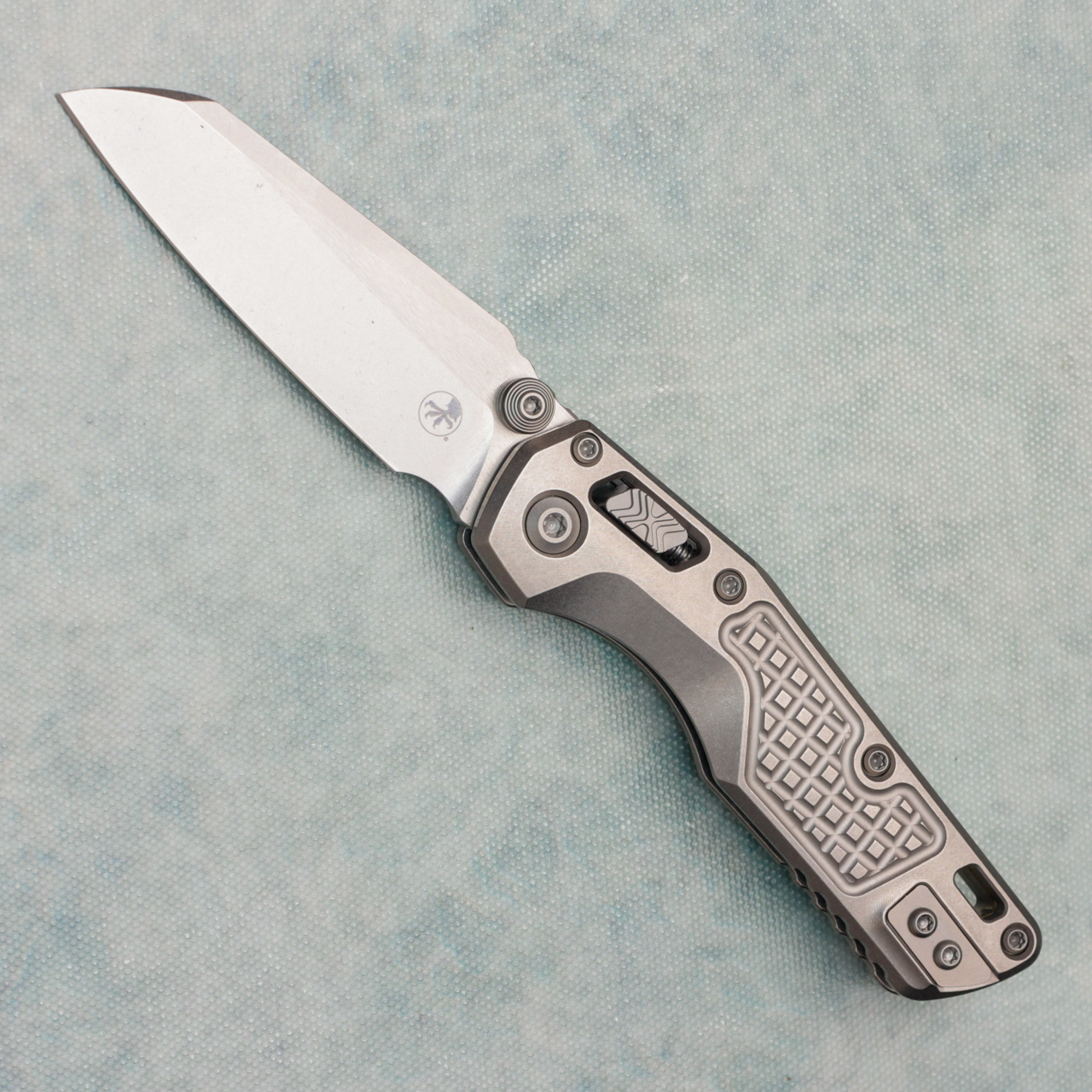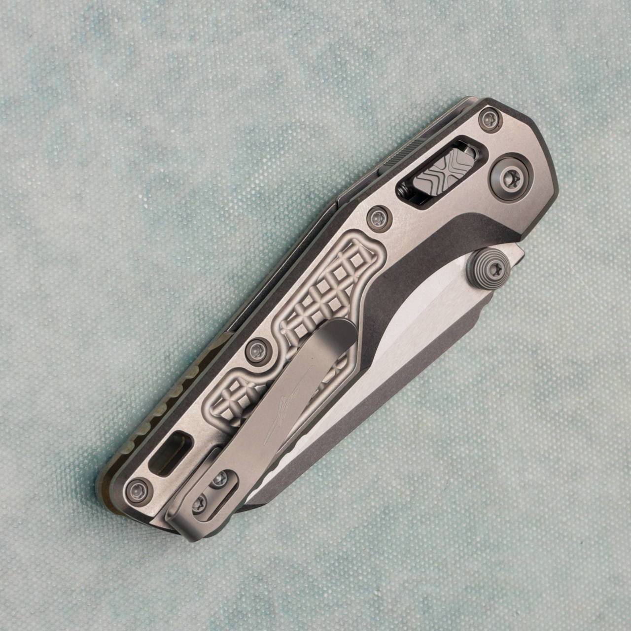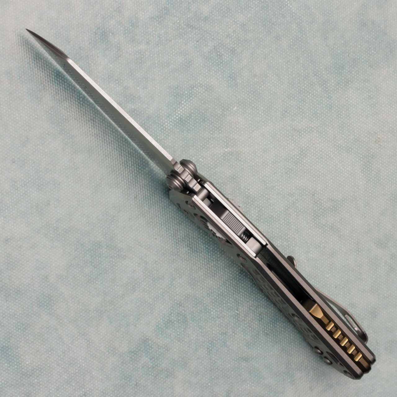 This model has frag stonewash titanium handles. Stonewash finished M390MK single edge blade. Complete with a bronze titanium backspacer and reversible pocket clip for left-hand carry. Double vapor blast accents. Brand new in box.