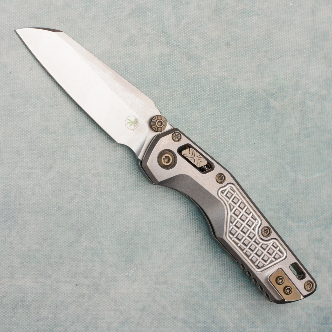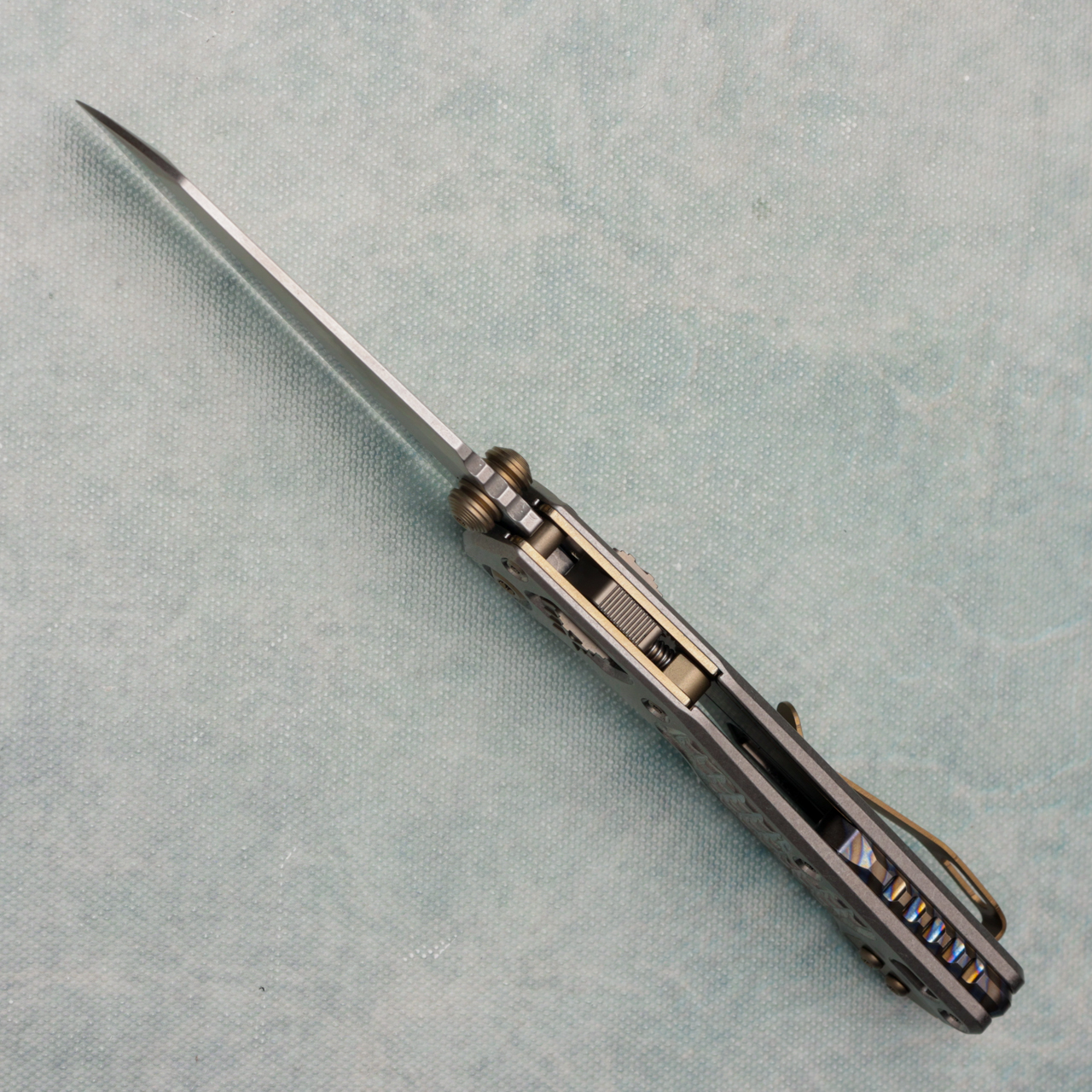 This model has frag stonewash titanium handles. Stonewash finished M390MK single edge blade. Complete with a flamed titanium backspacer and reversible pocket clip for left-hand carry. Bronzed double vapor blast accents. Brand new in box.