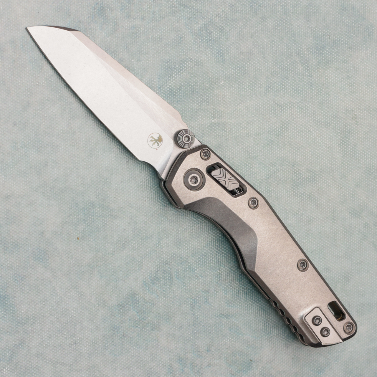 This model has stonewash titanium handles. Stonewash finished M390MK single edge blade. Complete with a bronze titanium backspacer and reversible pocket clip for left-hand carry. Double vapor blast accents. Brand new in box.