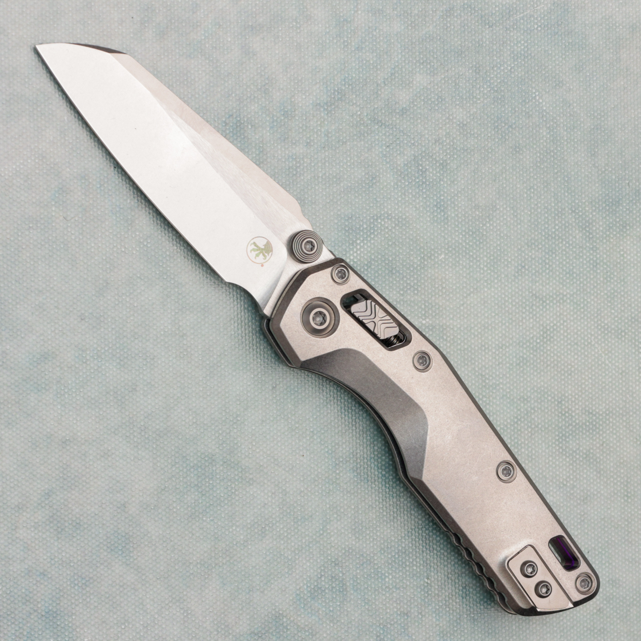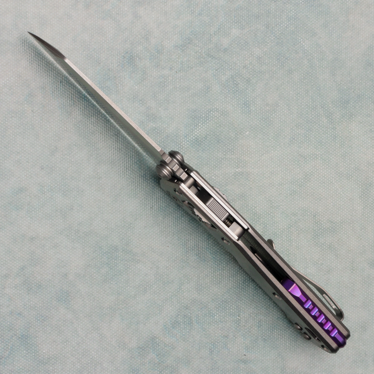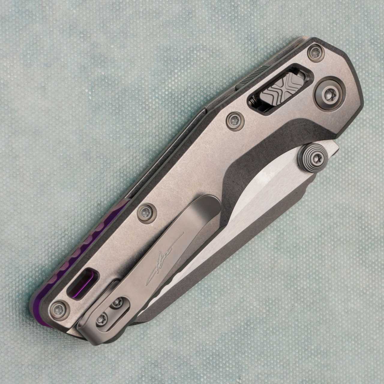 This model has stonewash titanium handles. Stonewash finished M390MK single edge blade. Complete with a purple titanium backspacer and reversible pocket clip for left-hand carry. Double vapor blast accents. Brand new in box.