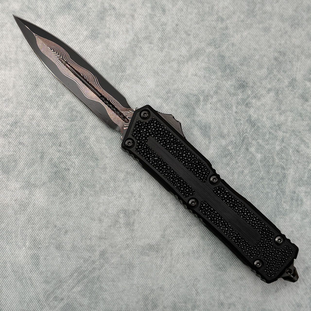 This Microtech Marfione Select model features black anodized hefted aircraft aluminum alloy handle scales with stingray inlays. Bakers Forge Coppermai Damascus double edge blade. Brand new in box with all the accessories.