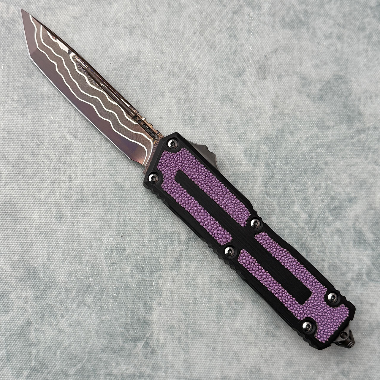 Microtech Marfione Select Scarab II Gen 3 T/E Purple Stingray Inlaid Handle Blued Baker Forge Coppermai Damascus Blade 1279-16MS3