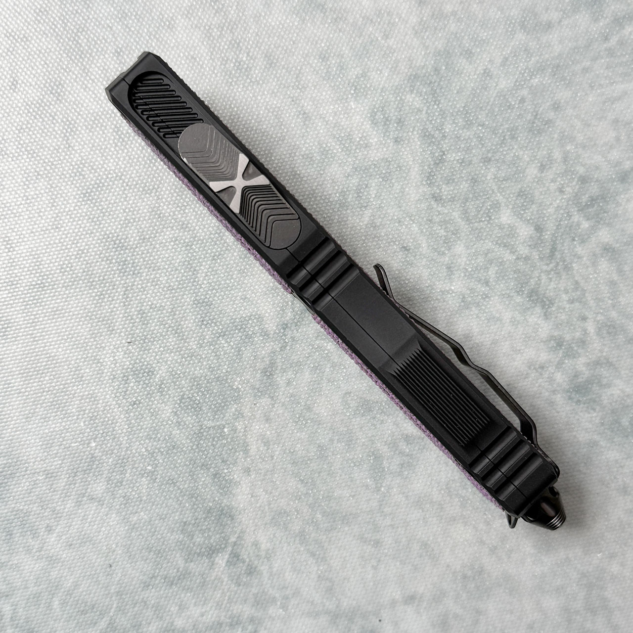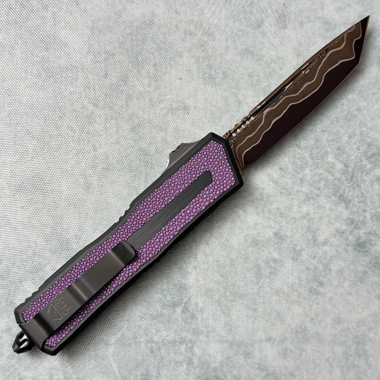 This Microtech Marfione Select model features black anodized hefted aircraft aluminum alloy handle scales with purple stingray inlays. Blued Bakers Forge Coppermai Damascus tanto edge blade. Brand new in box with all the accessories.