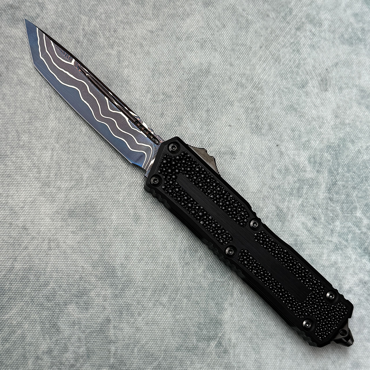 This Microtech Marfione Select model features black anodized hefted aircraft aluminum alloy handle scales with stingray inlays. Blued Bakers Forge Coppermai Damascus tanto edge blade. Brand new in box with all the accessories.