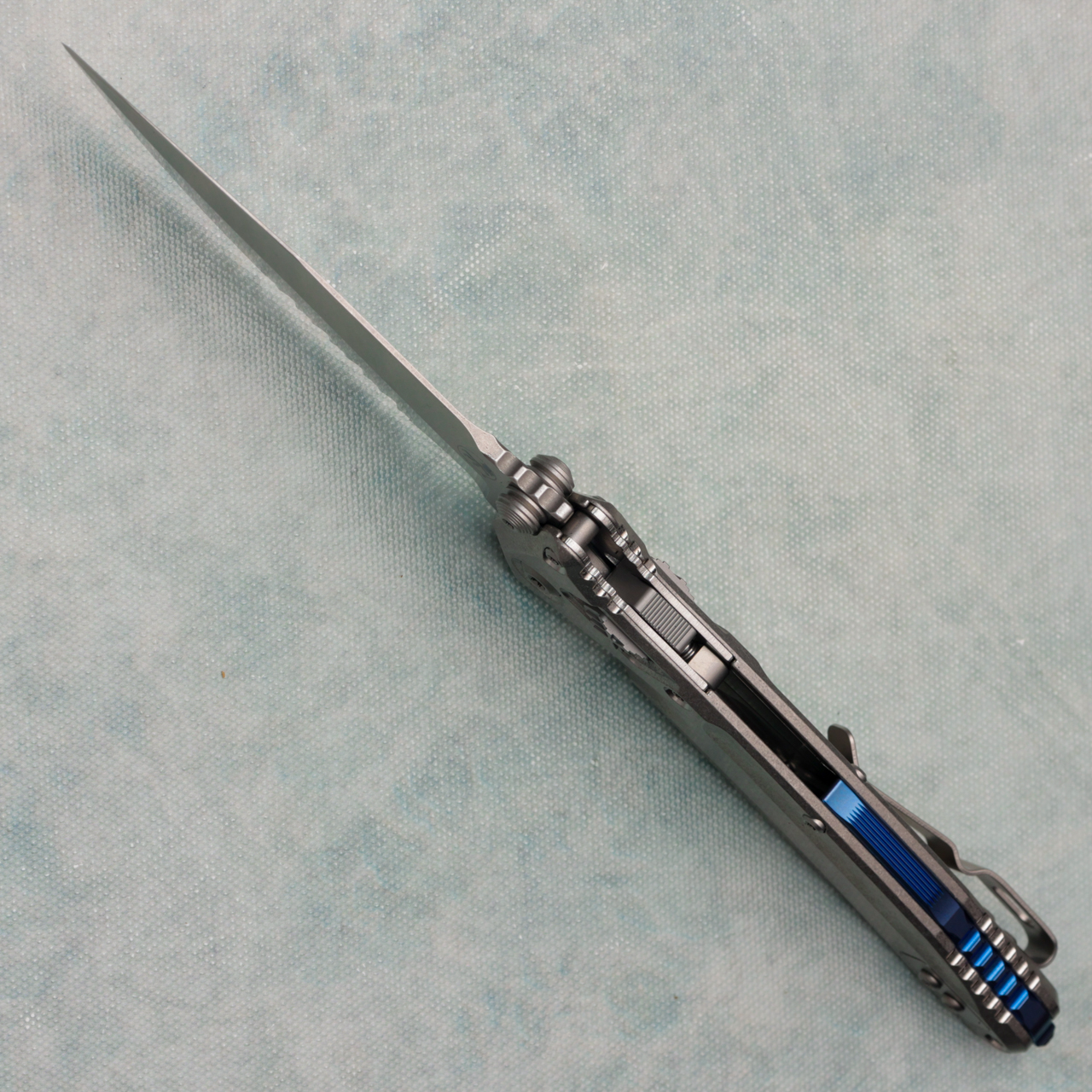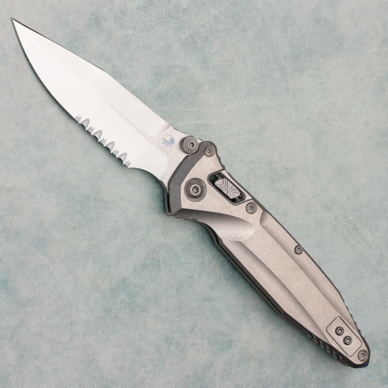 Microtech Marfione Select Socom Delta Ram-Lok Spear Point Stonewash Titanium Handle Stonewash Part Serrated Blade Blue Accent 159RL-11SMS3