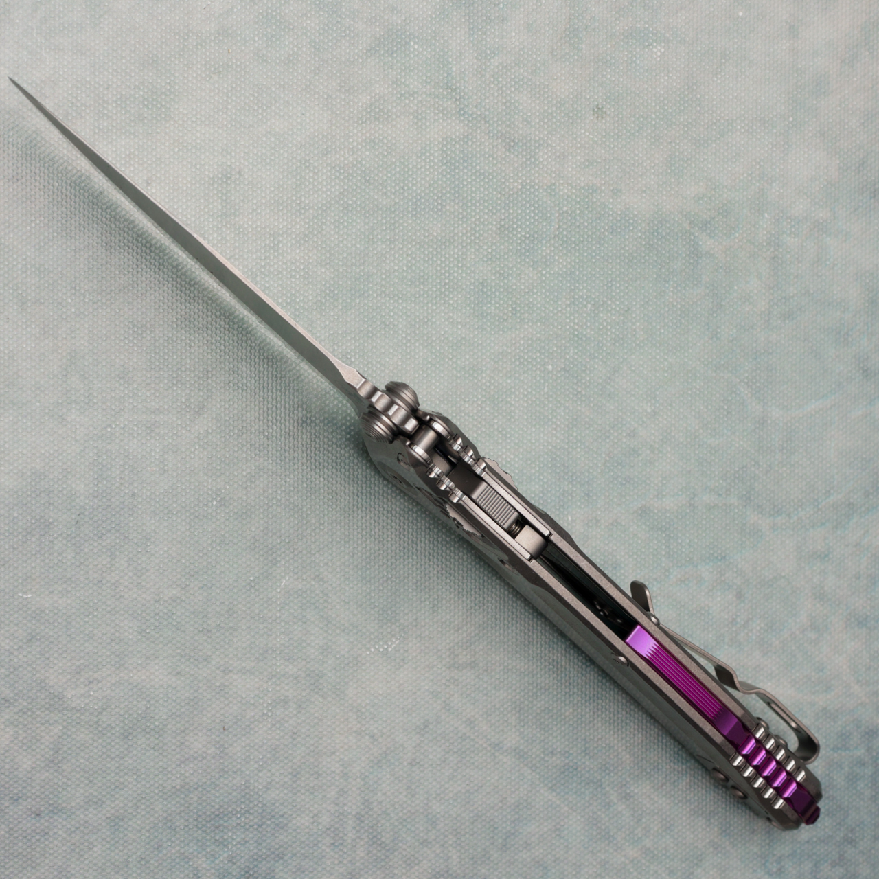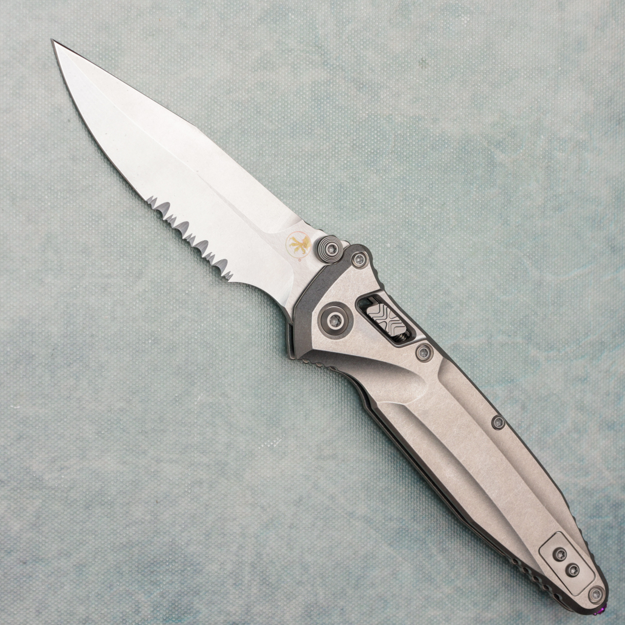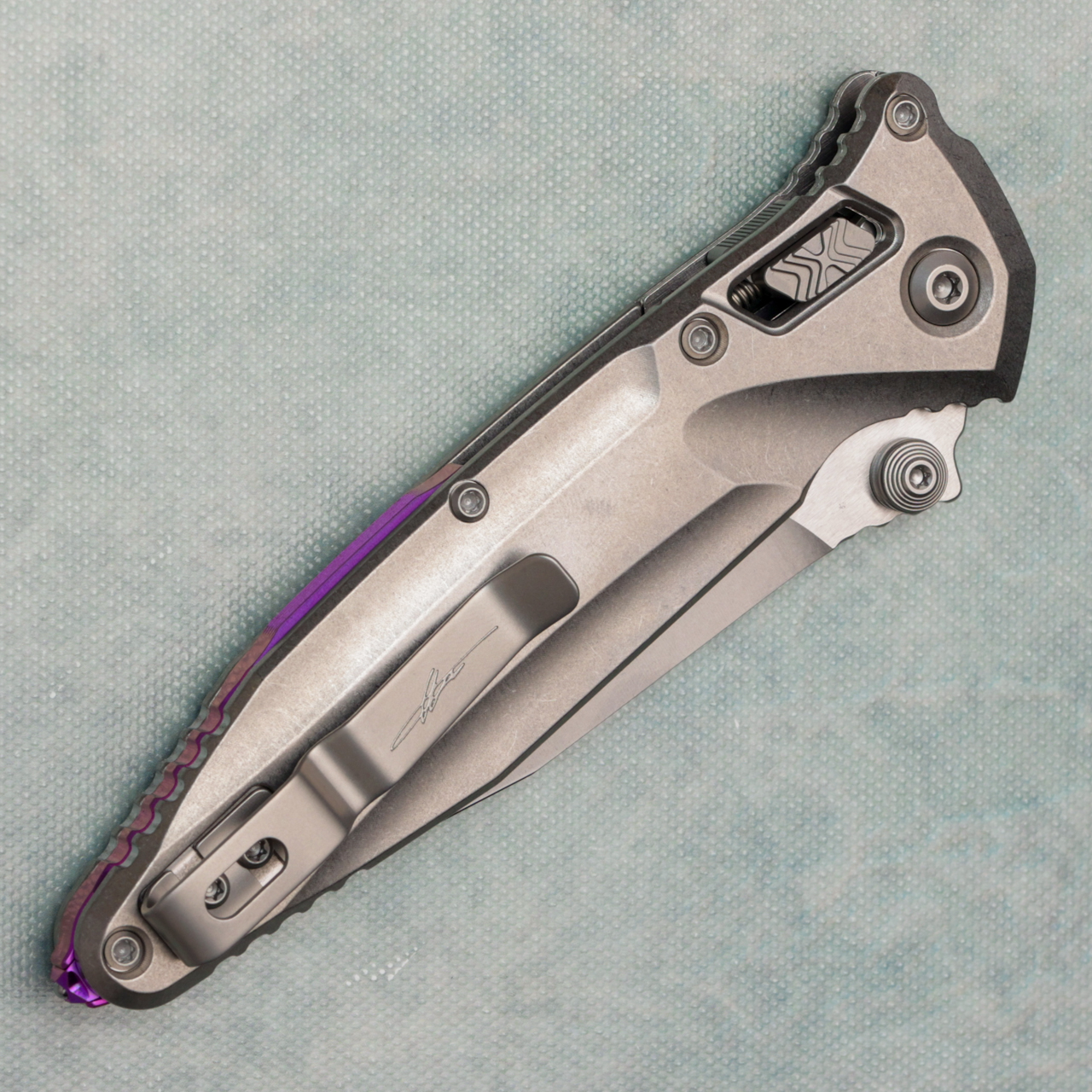 Microtech Marfione Select Socom Delta Ram-Lok Spear Point Stonewash Titanium Handle Stonewash Part Serrated Blade Purple Accent 159RL-11SMS4