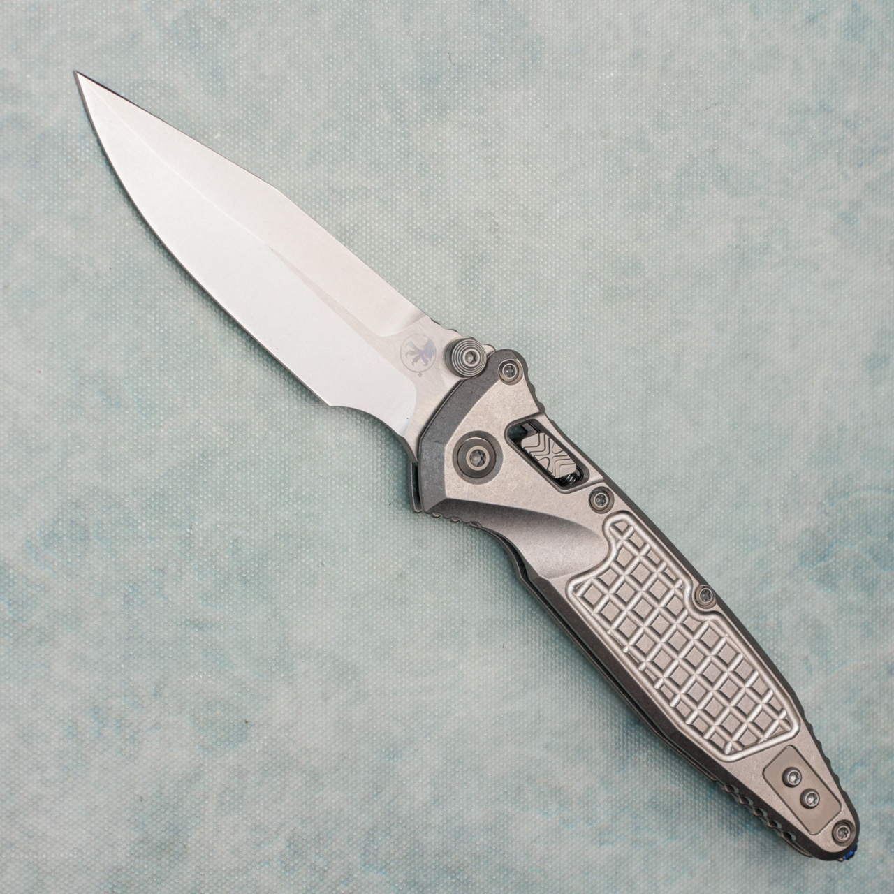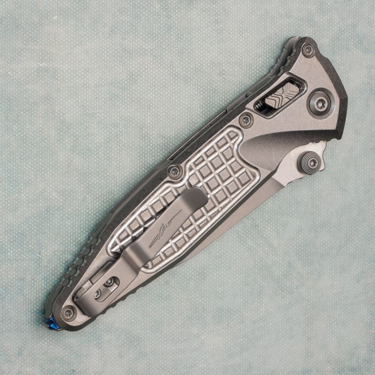 Microtech Marfione Select Socom Ram-Lok Spear Point Stonewash Frag Titanium Handle Stonewash Blade Blue Accent 160RL-10FRSMS1
