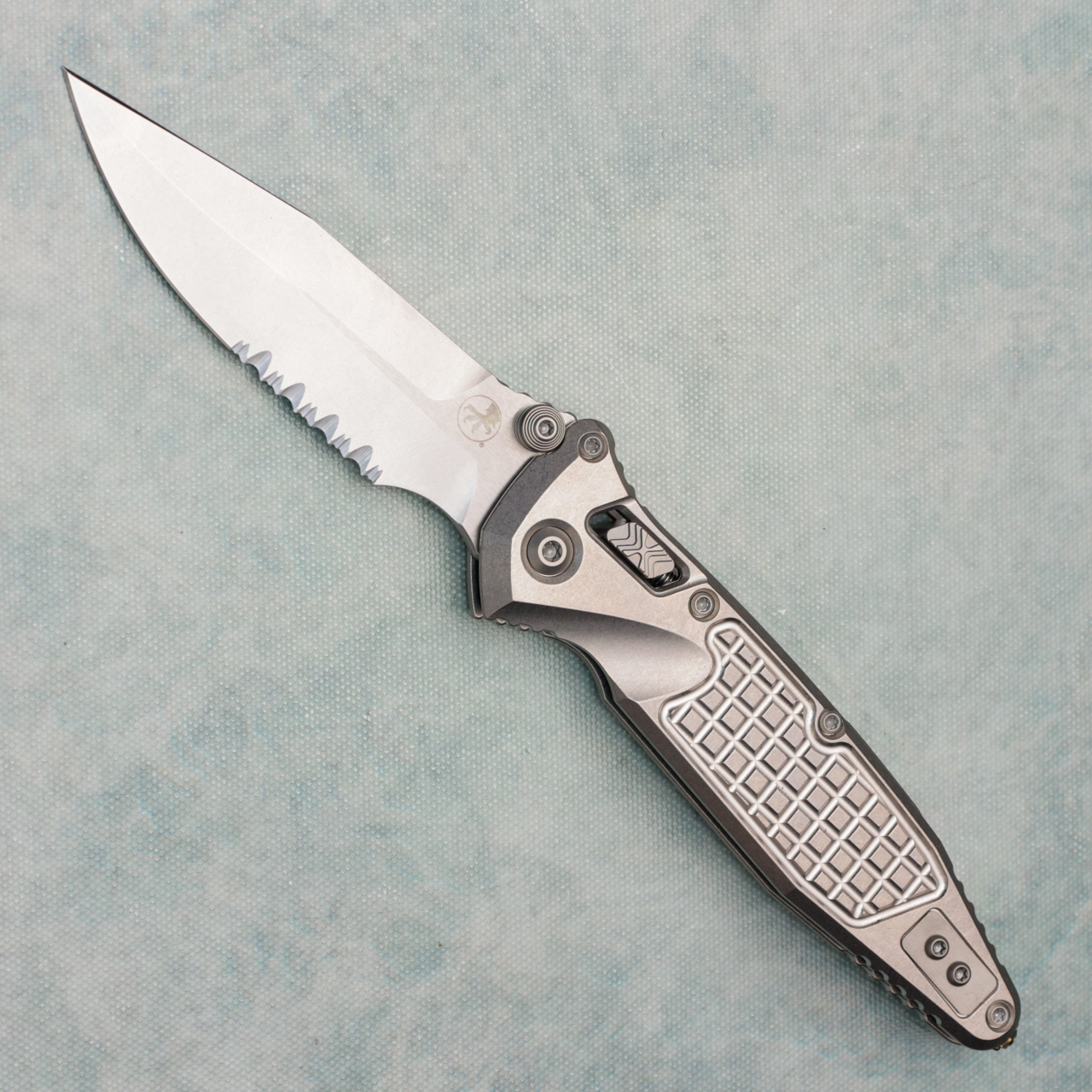 Microtech Marfione Select Socom Ram-Lok Spear Point Stonewash Frag Titanium Handle Stonewash Part Serrated Blade Bronze Accent 160RL-11FRSMS2