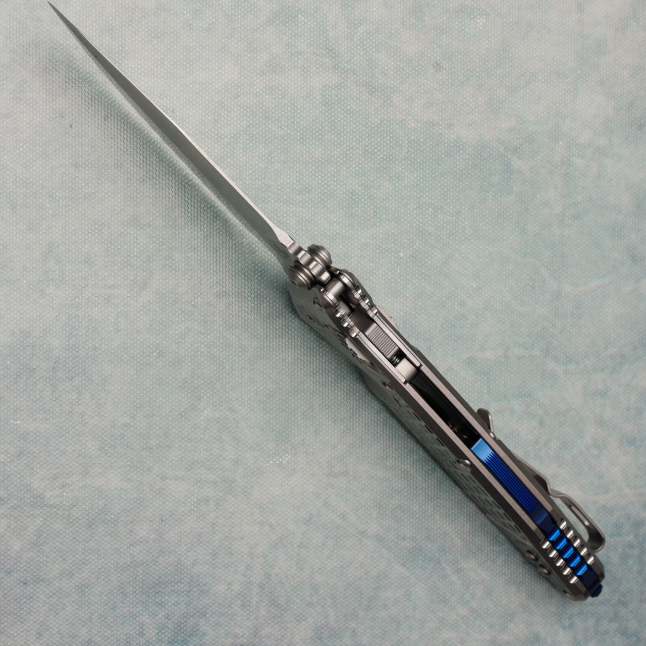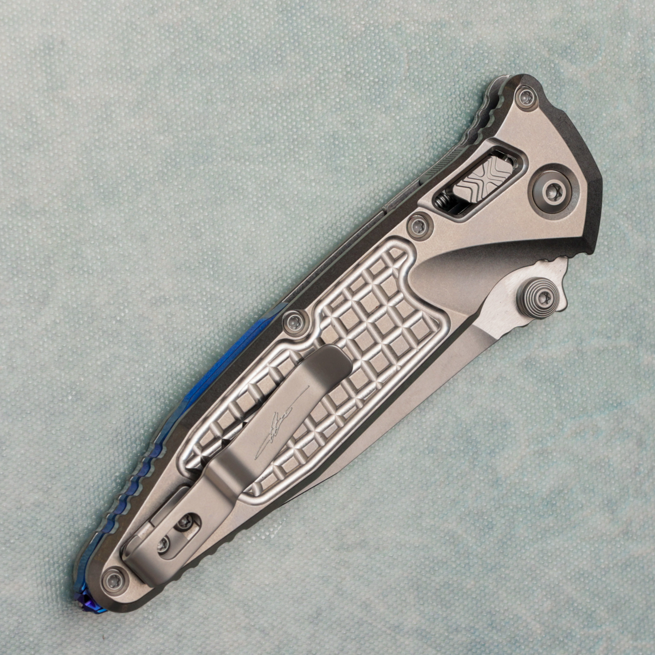 Microtech Marfione Select Socom Ram-Lok Spear Point Stonewash Frag Titanium Handle Stonewash Standard Blue Accent 160RL-10FRSMS3