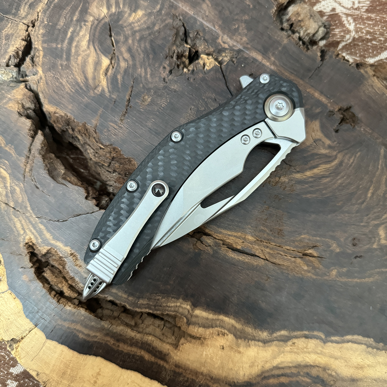 This variation features a titanium handle with carbon fiber scales. This full-size knife features a fully serrated bead blast finished M390 blade. Bronze titanium pivot collar. Features a tungsten glass breaker. Brand new in box.