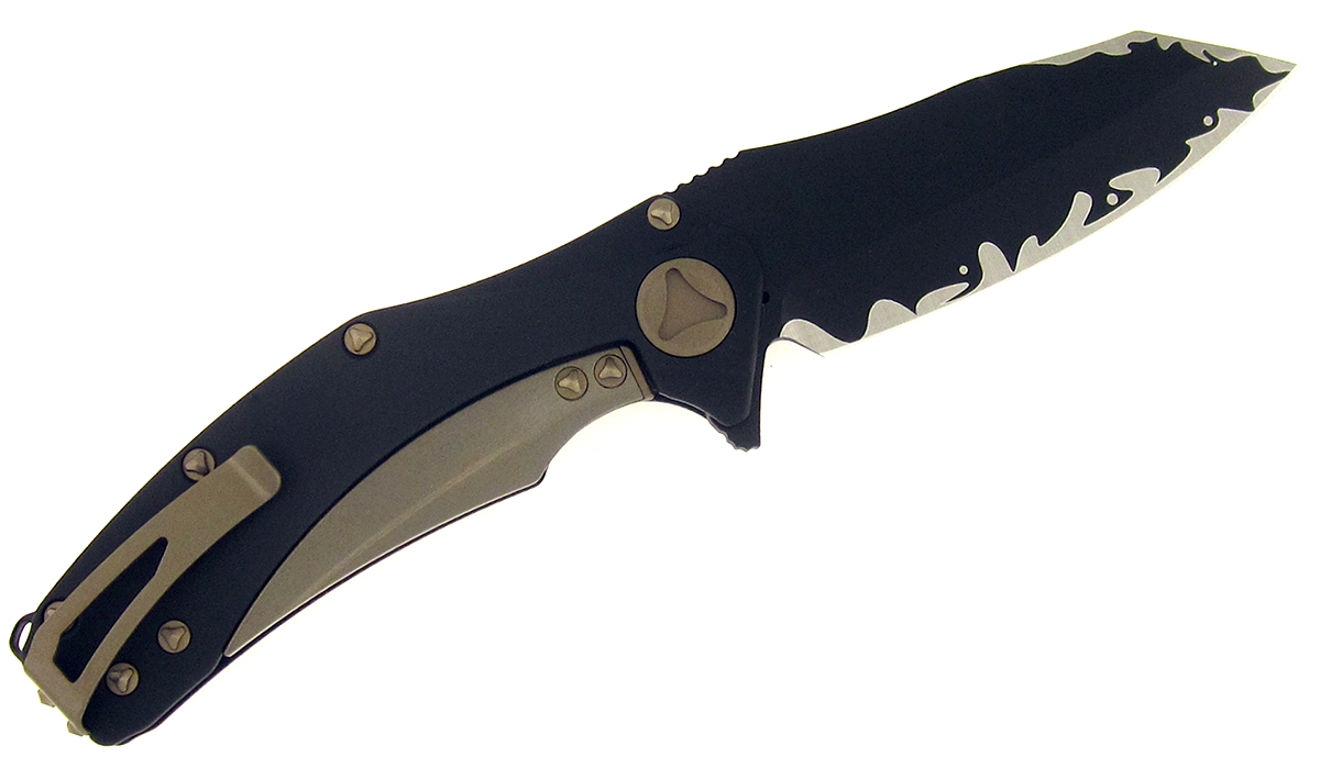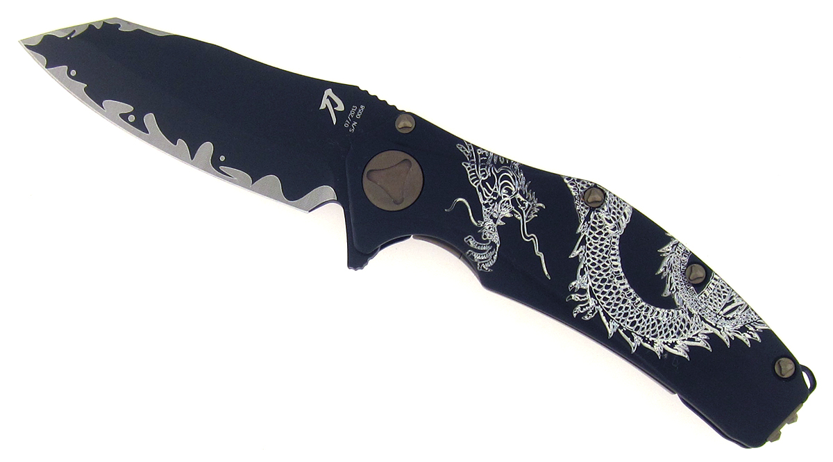 Microtech has released the limited edition Katana version of the popular Mini Matrix flipper. Black anodized machined aluminum handle with detailed silver dragon etching. Black DLC coated ATS-34 stainelss steel reverse tanto blade with satin finished design. The blade is designed for penetration. The flipper action on these is very smooth and the contoured handle is comfortable to hold. Excellent EDC size and weight along with the deep carry tip up pocket clip make this knife unoticed in the pocket. Bronze color finished titanium hardware. Lanyard loop. One of my favorite Microtech knives! Brand new in box.