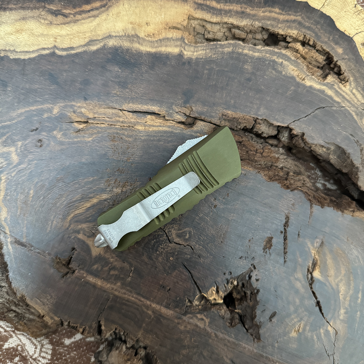 This model features OD Green finished 6061-T6 aluminum handle scales with the Microtech Claw logo on the front. Apocalyptic finished M390 stainless steel double edge dagger blade with standard cutting edges. Bead blast finished hardware, reversible pocket clip, lanyard hole, and glass breaker. The blade has the model information. The clip features the Microtech logo, serial number, and production date. Brand new in box.