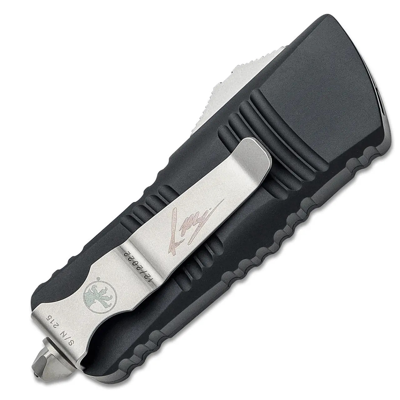 This model features black anodized 6061-T6 aluminum handle scales with the Sean Marfione dagger logo on the front. Stonewash finished M390 stainless steel Hellhound tanto blade. Bead blast finished hardware. Reversible pocket clip, lanyard hole, and glass breaker. The clip features the Microtech claw logo, serial number, production date, and Sean Marfione signature. Brand new in box.