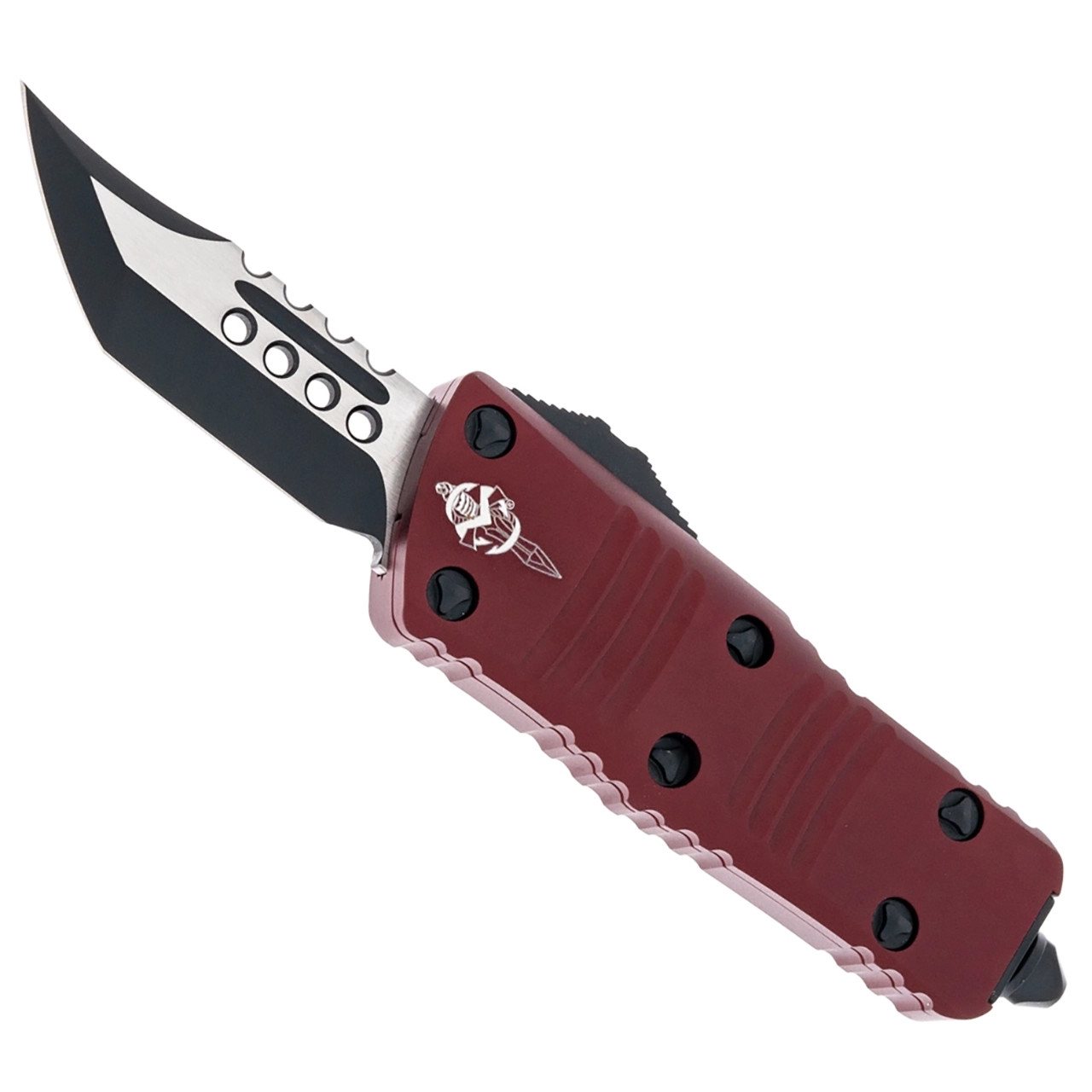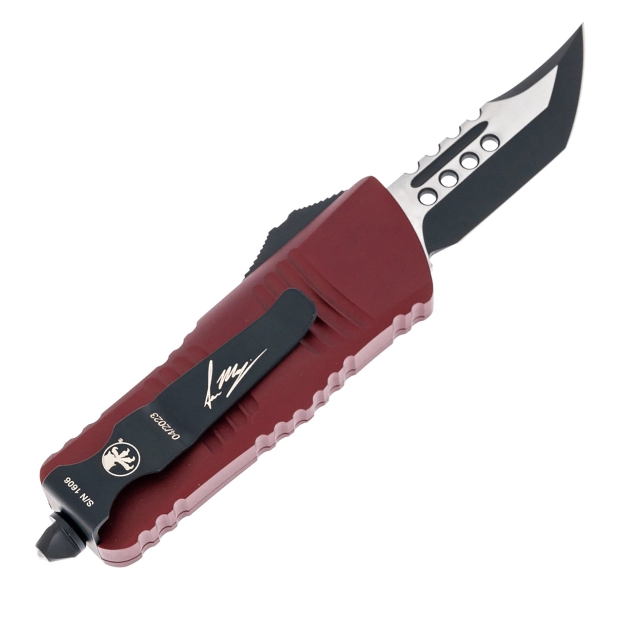 This model features merlot aluminum handle scales with the Sean Marfione dagger logo on the front. Two Tone black finished M390 stainless steel Hellhound tanto blade. Black finished hardware, reversible pocket clip, lanyard hole, and glass breaker. The clip features the Microtech claw logo, serial number, production date, and Sean Marfione signature. Brand new in box.