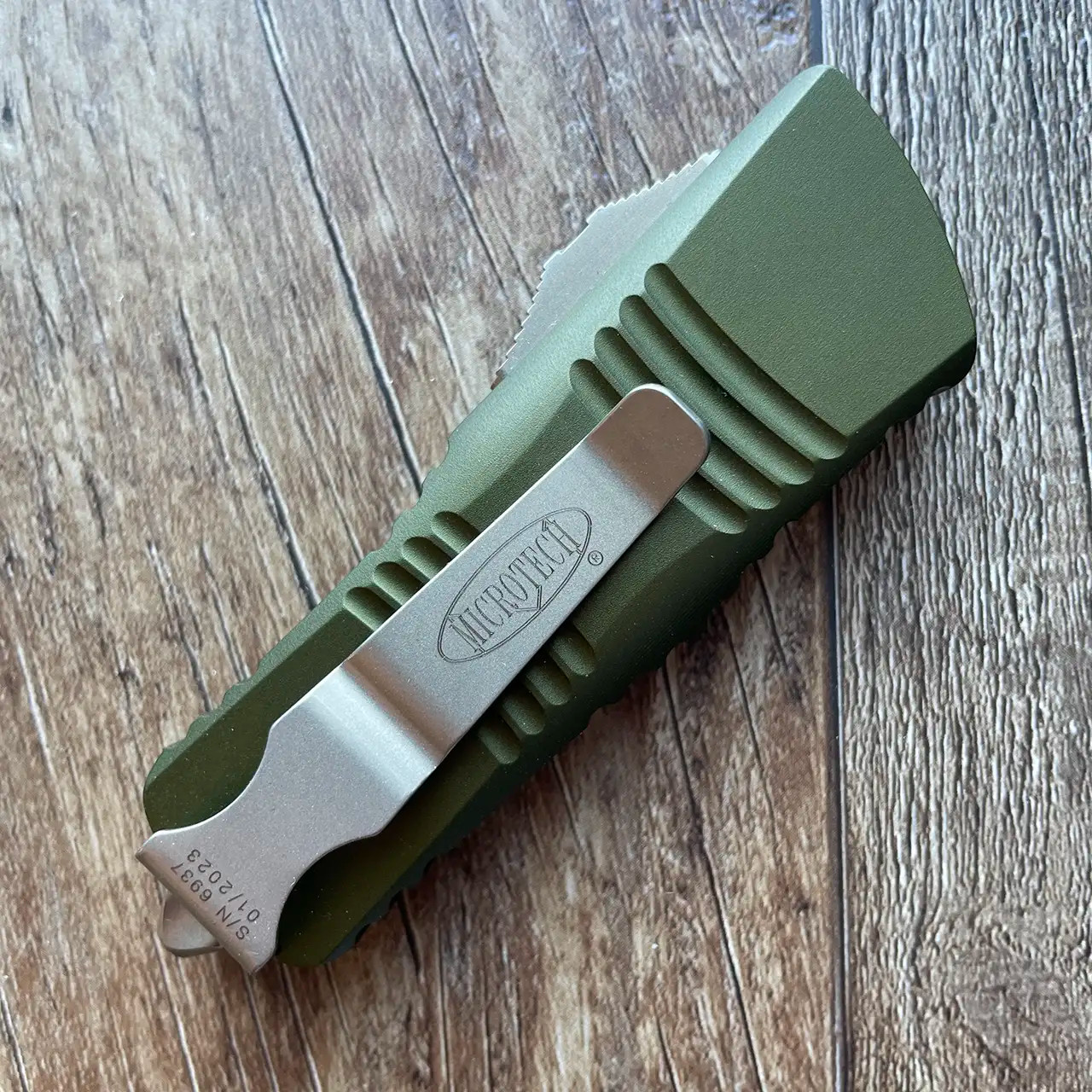 This model features OD Green finished aluminum handle scales with the Microtech Claw logo on the front. Bronzed finished M390 stainless steel tanto edge blade with standard cutting edge. Bronzed finished hardware, reversible pocket clip, lanyard hole, and glass breaker. The blade has the model information. The clip features the Microtech logo, serial number, and production date. Brand new in box.
