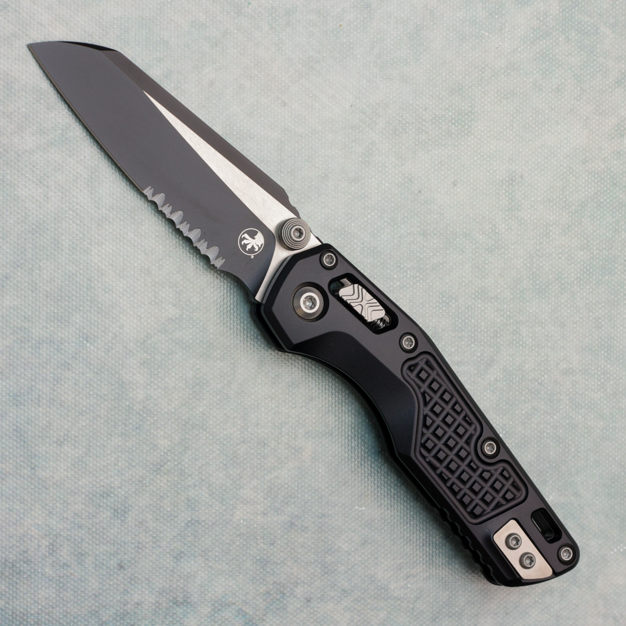 This model has frag black aluminum handles. Black finished M390MK single edge part serrated blade. Complete with a titanium backspacer and reversible pocket clip for left-hand carry. Brand new in box.