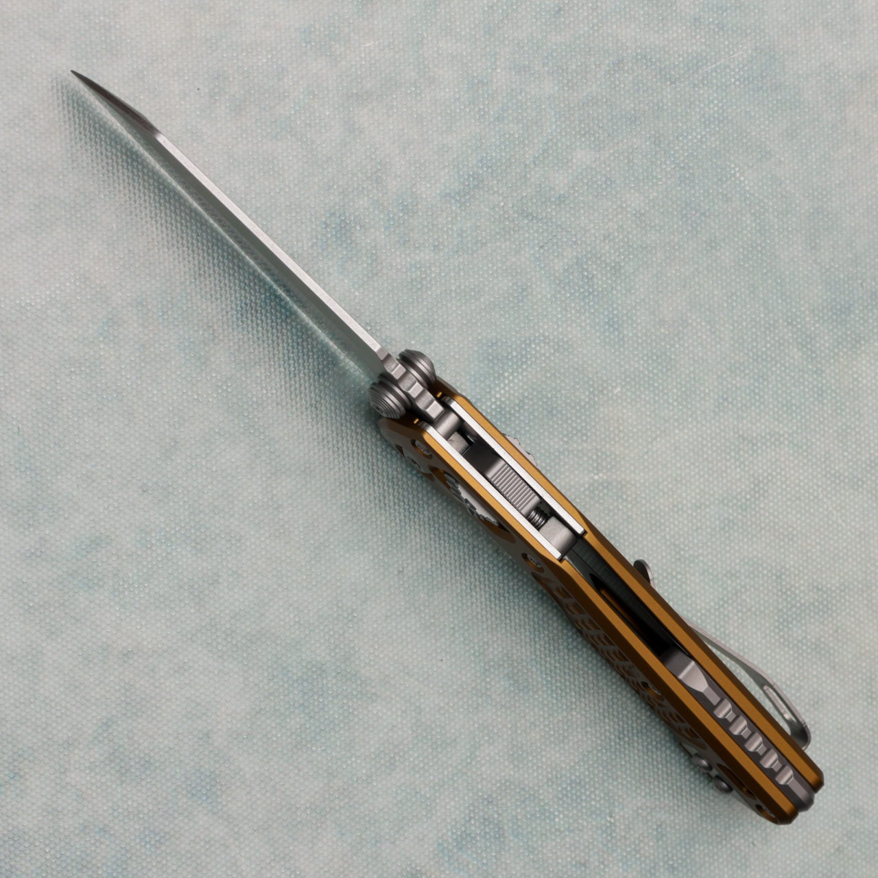 This model has frag tan aluminum handles. Stonewash finished M390MK single edge blade. Complete with a titanium backspacer and reversible pocket clip for left-hand carry. Brand new in box.