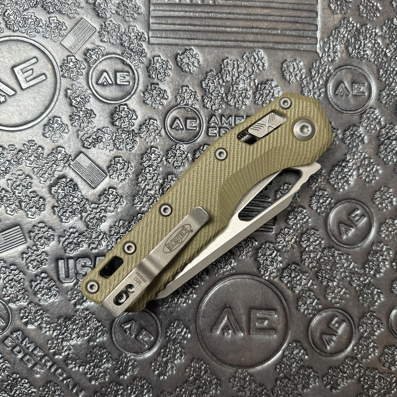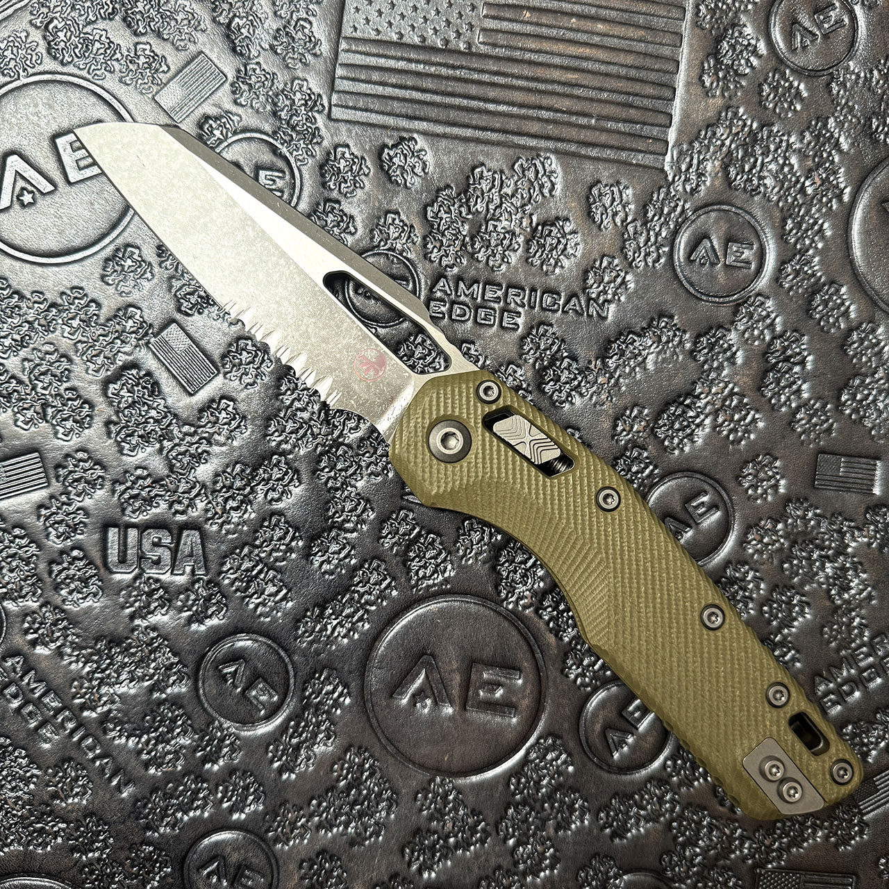 This model has a OD Green fluted G-10 Handle. Apocalyptic finished M390MK single edge partially serrated blade. The G10 handle contains hardened steel liner plates, which gives the knife its rigidity. Complete with a titanium backspacer and reversible pocket clip for left-hand carry. Brand new in box.