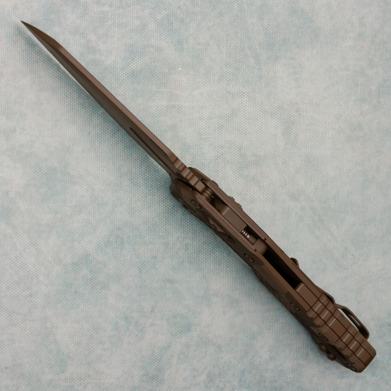 This model has chocolate camo tri-grip texture polymer handles. Chocolate camo cerakote M390MK single edge blade. Chocolate finished hardware and reversible pocket clip. Brand new in box.