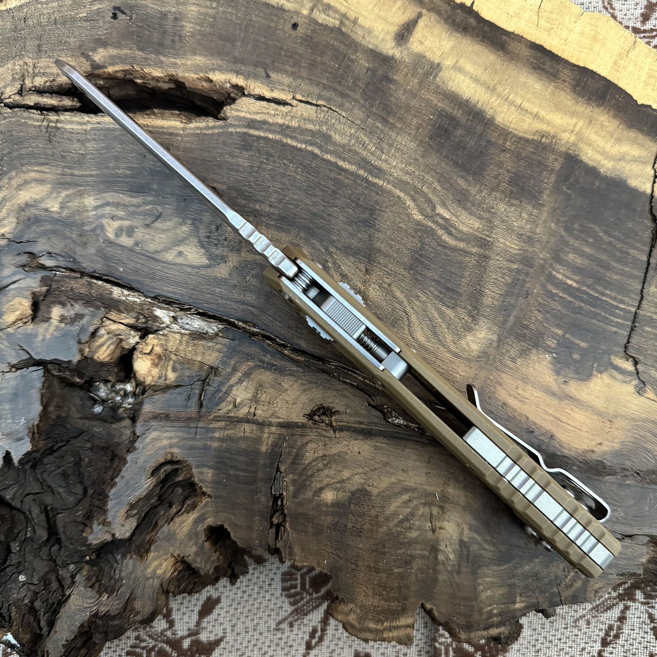 This model has a dark earth tri-grip texture polymer handle. Stonewash finished M390MK single-edge, fully serrated blade. Bead Blast finished hardware and reversible pocket clip. Brand new in box.